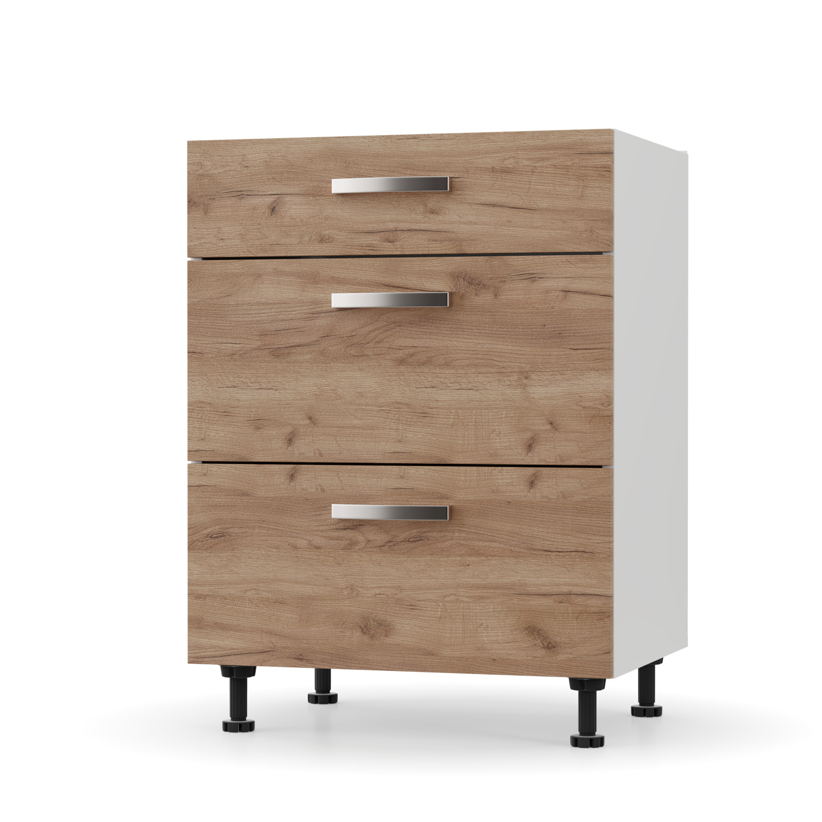 Συρταριέρα Κουζίνας 60×46.5×82 εξαιρετικής ποιότητας και υψηλής αντοχής, σε απόχρωση χρυσού δρυς. Το έπιπλο διαθέτει τρία συρτάρια.