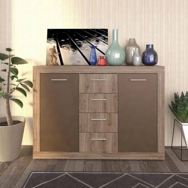 Μπουφές υψηλής ποιότητας και αντοχής,σε απόχρωση σονόμα.Το έπιπλο διαθέτει δύο ντουλάπια, δύο συρτάρια καθώς και ένα ράφι, το οποίο δημιουργεί δύο ανοιχτους χώρους,τοποθέτησης διακοσμητικών. Ιδανική λύση για να διακοσμήσετε και να οργανώσετε τον χώρο σας.