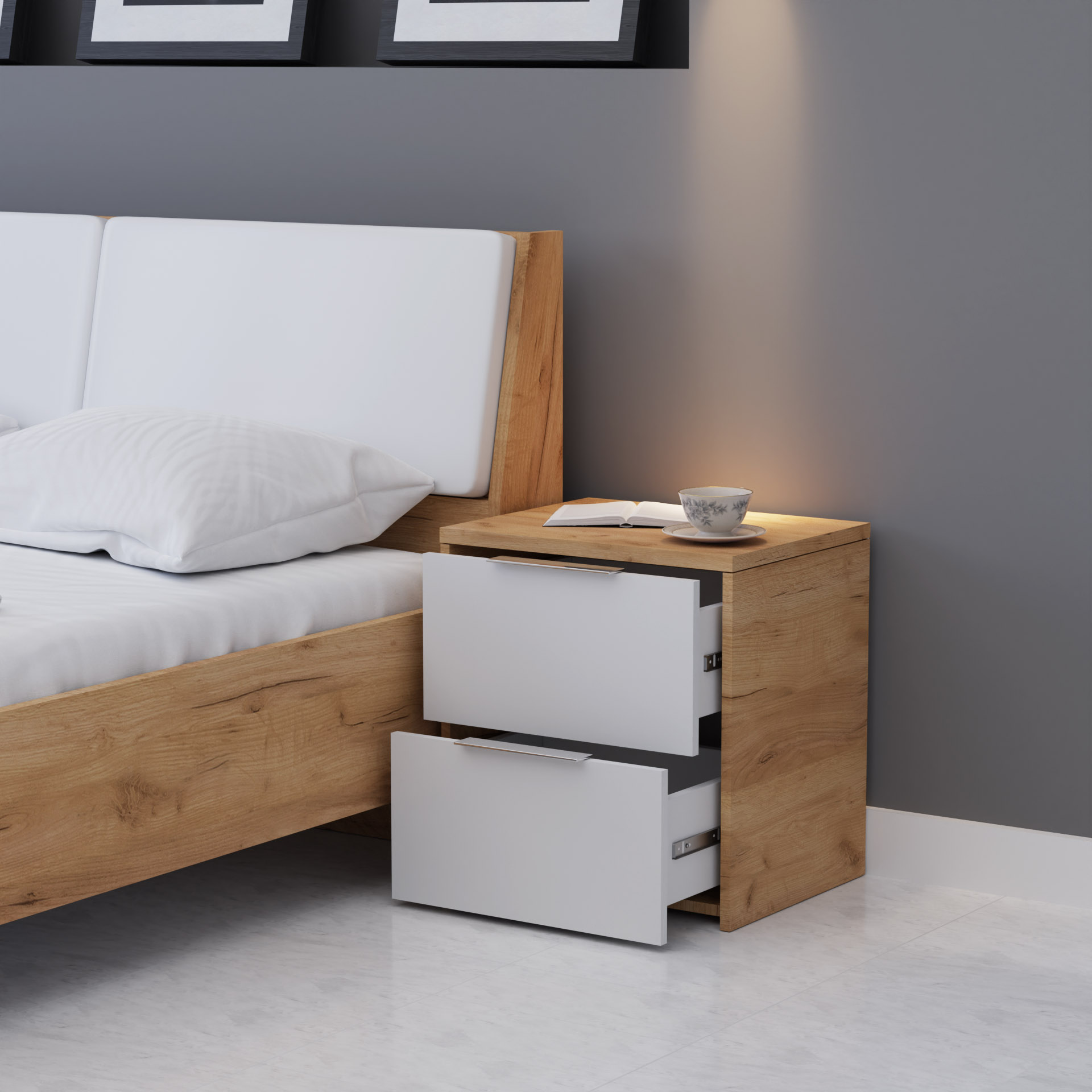 Κομοδίνο Avanti εξαιρετικής ποιότητας και υψηλής αντοχής σε ιδιαίτερη απόχρωση χρυσό δρυς και λευκό. Το έπιπλο διαθέτει δύο συρτάρια με δύο μεταλλικά πόμολα, για την τοποθέτηση των προσωπικών σας αντικειμένων. Ιδανική λύση για να διακοσμήσετε και να οργάνωσετε το υπνοδωμάτιο σας.