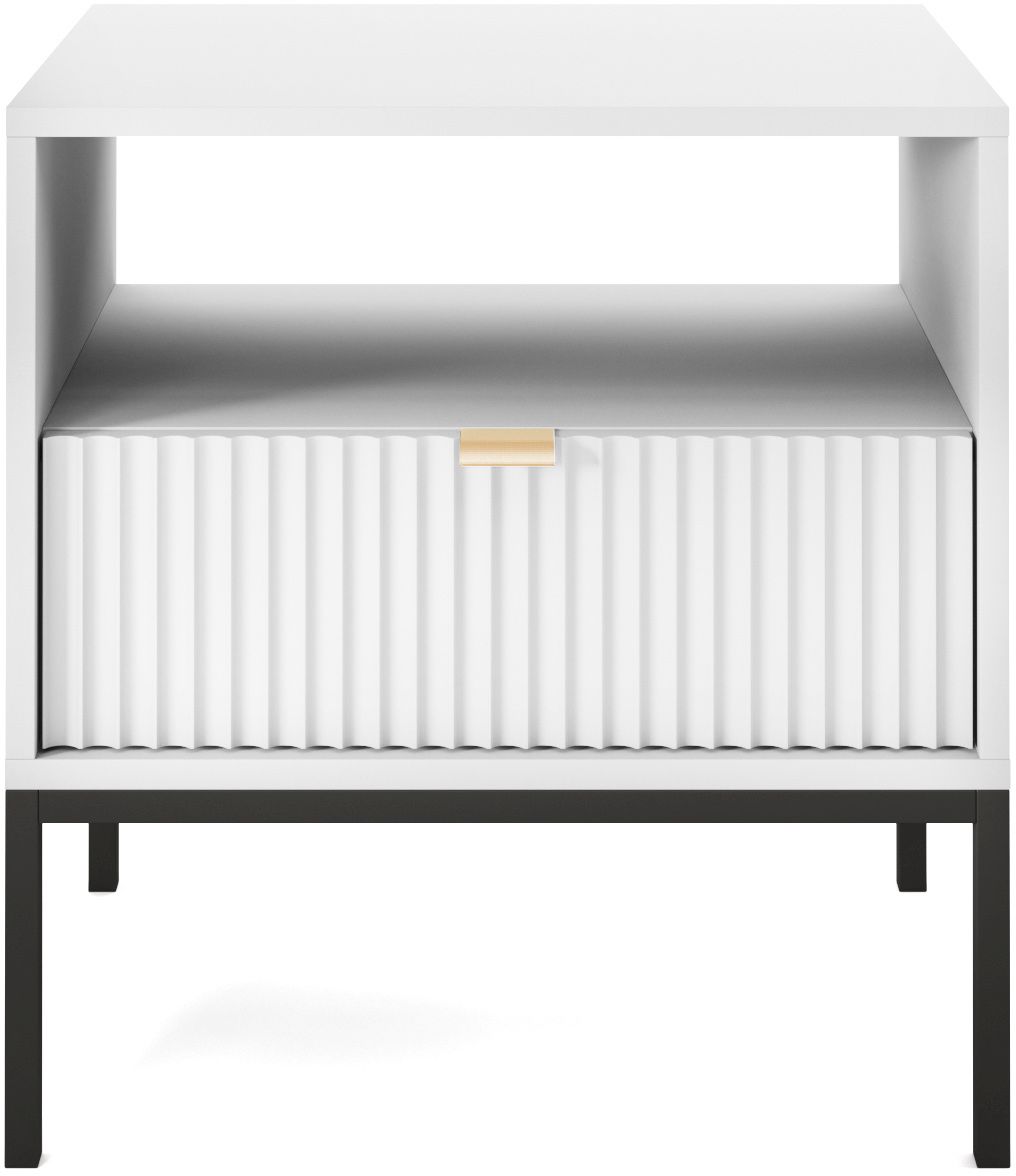 Ο μοντέρνος, μινιμαλιστικός σχεδιασμός σε συνδυασμό με το λευκό χρώμα κάνει τα κομοδίνα Nova να φαίνονται εξαιρετικά κομψά και μοντέρνα. Μια απλή αλλά κομψή φόρμα με διακοσμητικά αυλάκια στη μπροστινή όψη είναι ότι πρέπει για τους λάτρεις του μοντέρνου design. Η μεταλλική βάση δίνει στη δομή ελαφρότητα και το σύνολο συμπληρώνεται από διακοσμητικές λαβές σε χρυσό.