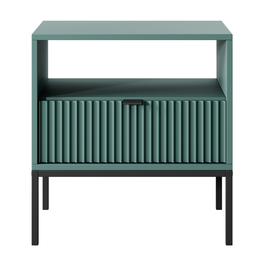 Ο μοντέρνος, μινιμαλιστικός σχεδιασμός σε συνδυασμό με το σκούρο πράσινο κάνει τα κομοδίνα Nova να φαίνονται εξαιρετικά κομψά και μοντέρνα. Μια απλή αλλά κομψή φόρμα με διακοσμητικά αυλάκια στη μπροστινή όψη είναι ότι πρέπει για τους λάτρεις του μοντέρνου design. Η μεταλλική βάση δίνει στη δομή ελαφρότητα και το σύνολο συμπληρώνεται από διακοσμητικές λαβές σε ανθρακί.