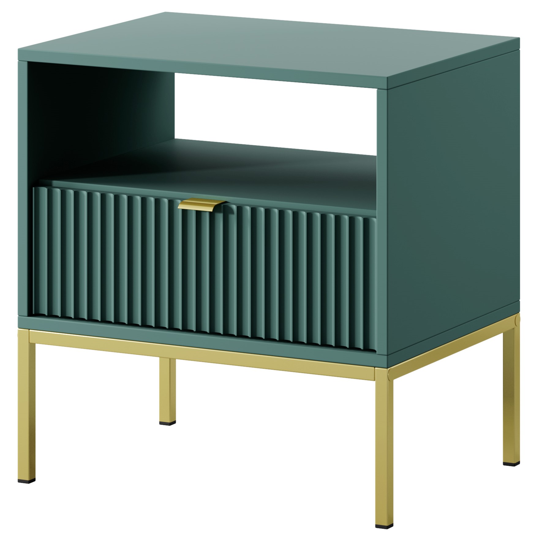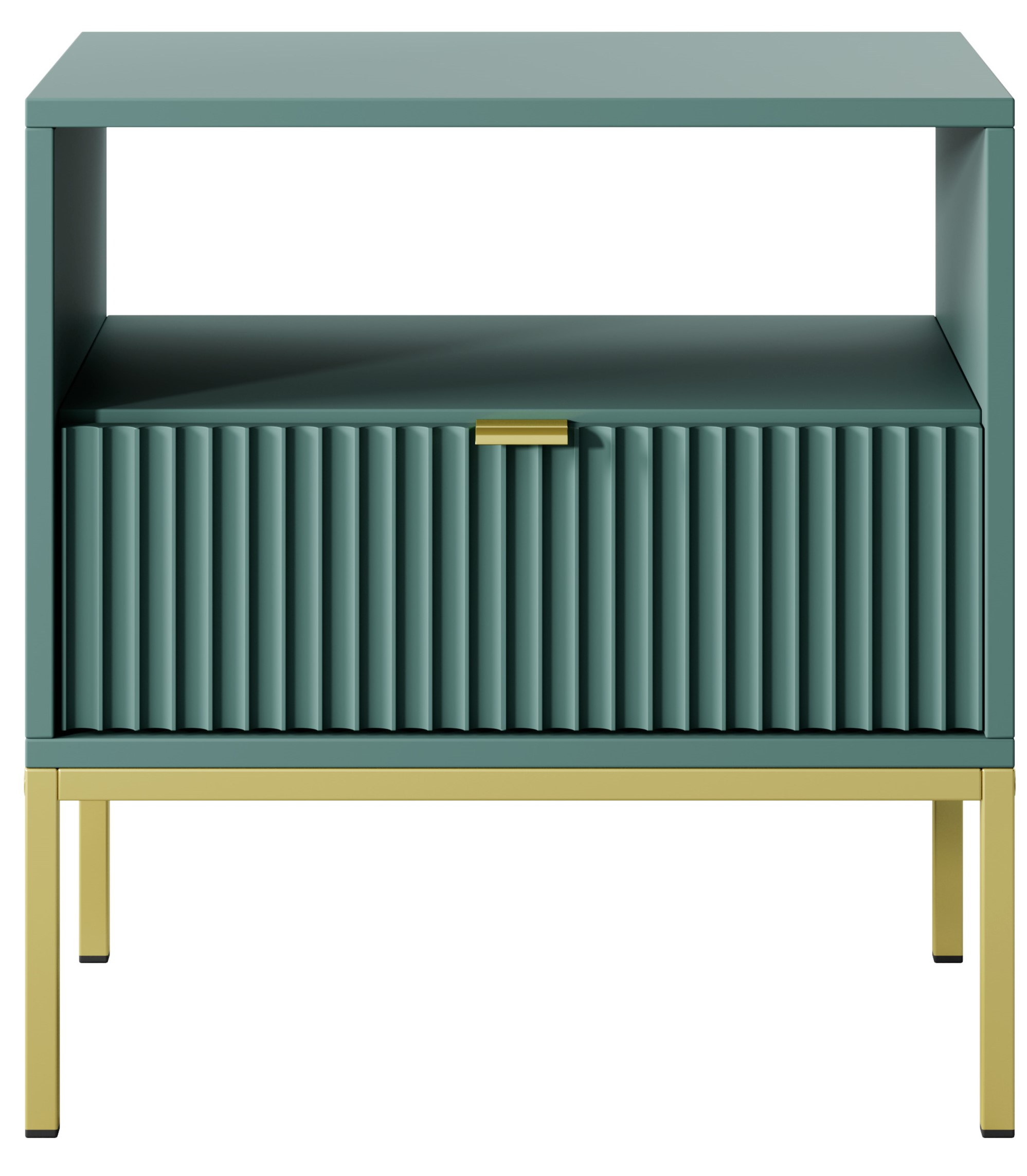Ο μοντέρνος, μινιμαλιστικός σχεδιασμός σε συνδυασμό με το σκούρο πράσινο χρώμα κάνει τα κομοδίνα Nova να φαίνονται εξαιρετικά κομψά και μοντέρνα. Μια απλή αλλά κομψή φόρμα με διακοσμητικά αυλάκια στη μπροστινή όψη είναι ότι πρέπει για τους λάτρεις του μοντέρνου design. Η μεταλλική βάση δίνει στη δομή ελαφρότητα και το σύνολο συμπληρώνεται από διακοσμητικές λαβές σε χρυσό.