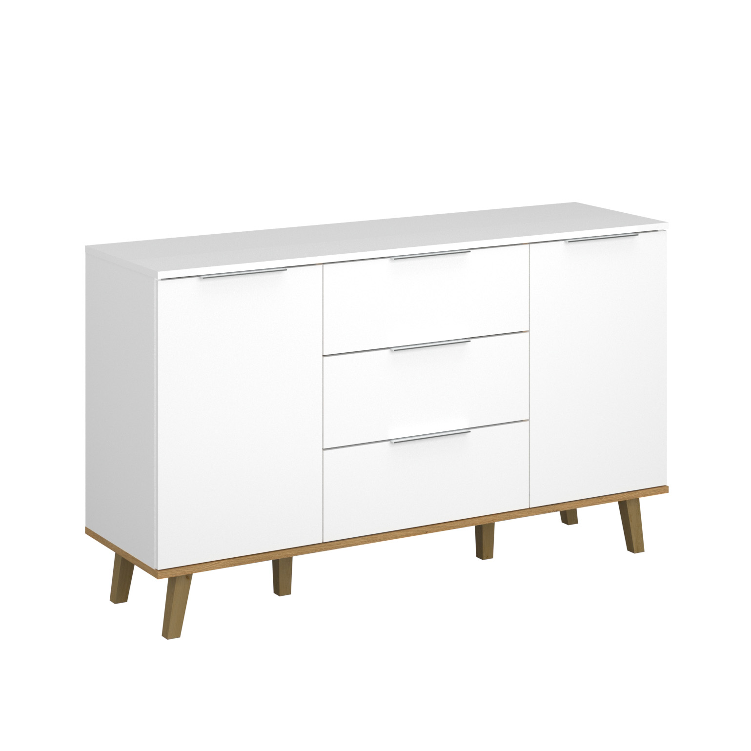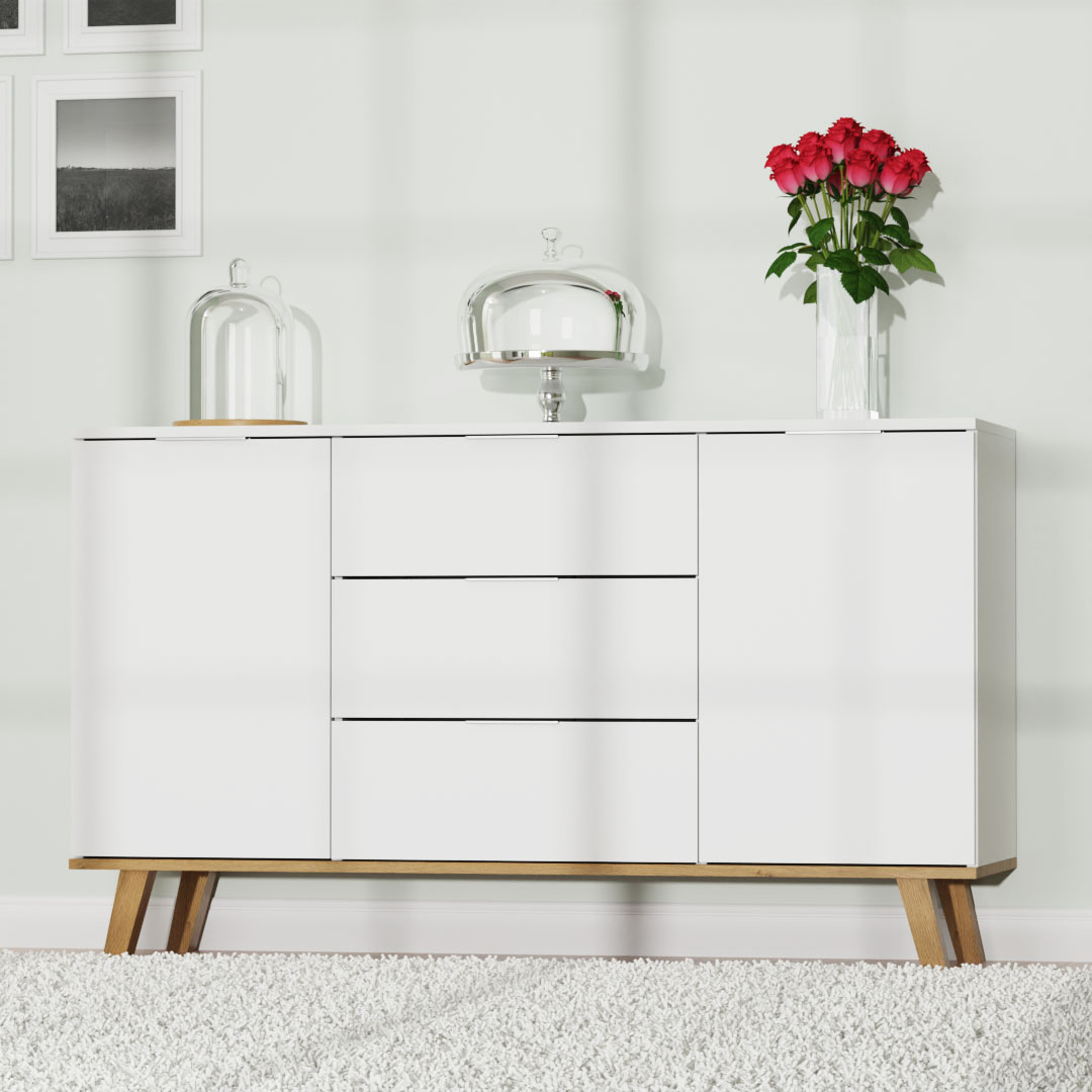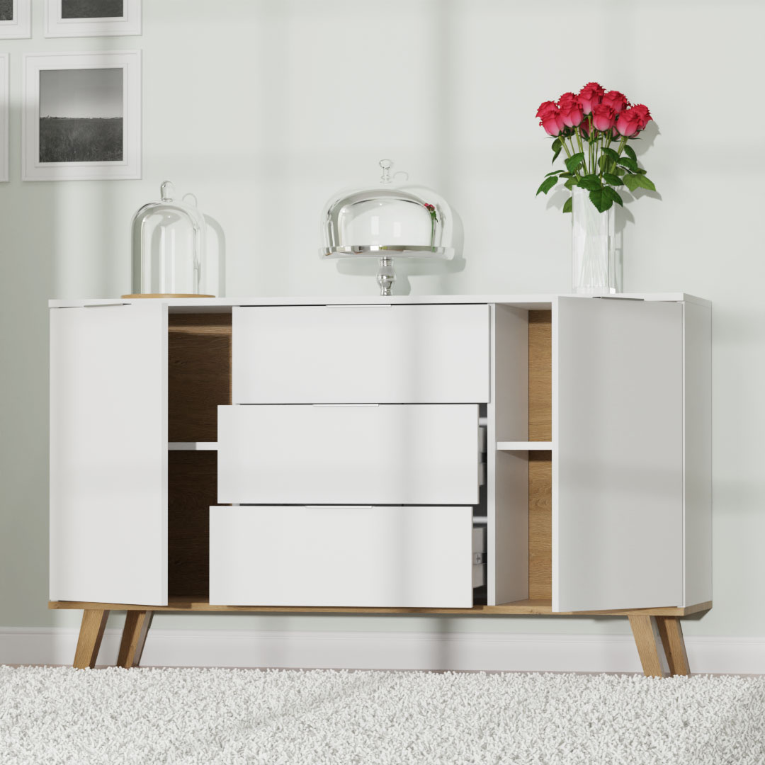 Μπουφές Neptune εξαιρετικής ποιότητας και υψηλής αντοχής σε λευκή απόχρωση με σονόμα στο κάτω μέρος. Το έπιπλο διαθέτει δύο ντουλάπια με εσωτερικό ράφι, τρία συρτάρια για εξτρά αποθηκευτικό χώρο, καθώς και έξι μασίφ ξύλινα πόδια για την στήριξη του επίπλου.