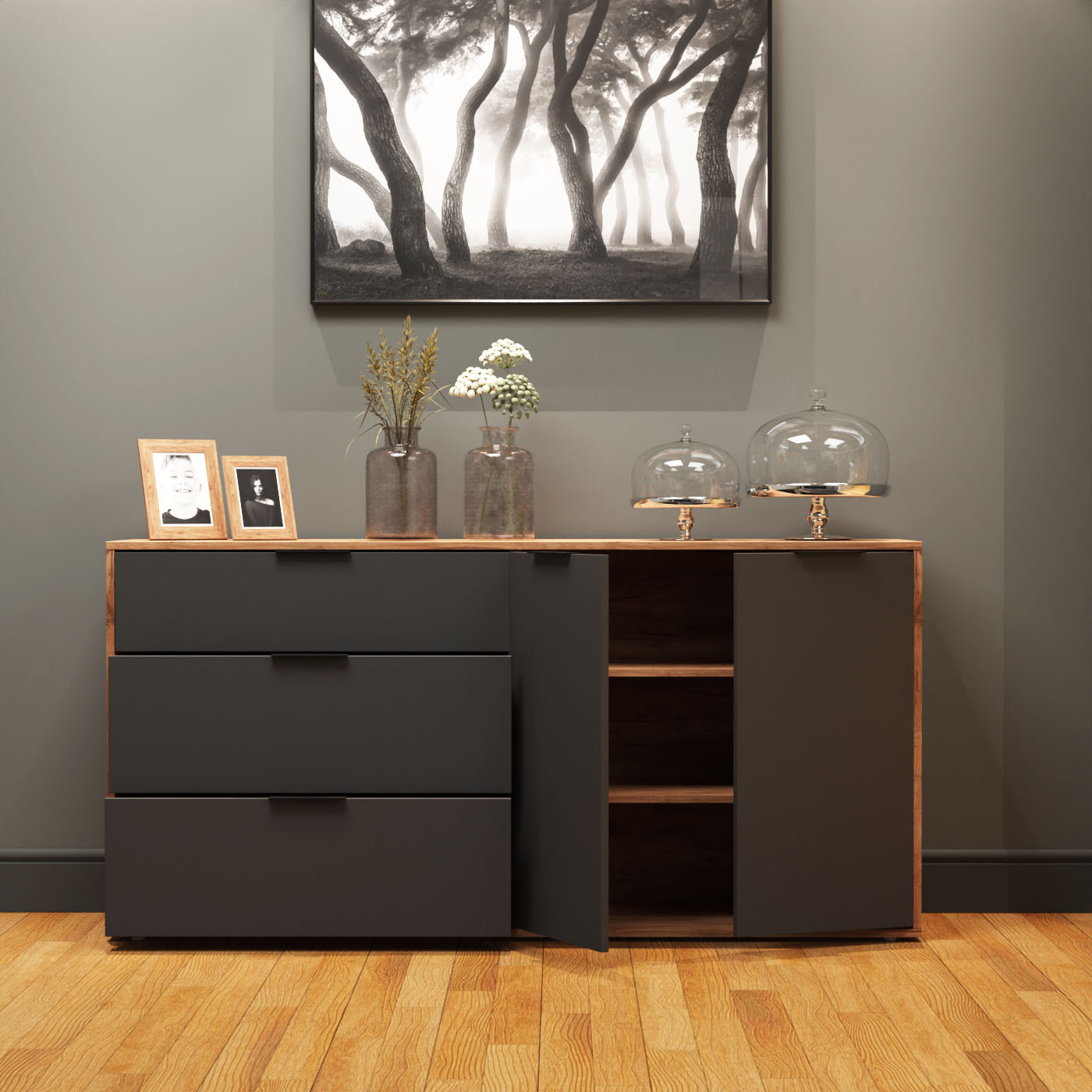 Μπουφές NITRO, Μινιμαλιστική σχεδίαση, μοντέρνα και λιτή σε στύλ loft, Ο όμορφος χρωματικός συνδυασμός φυσικού ξύλου και γκρίζου γραφίτη θα προσφέρει στο χώρο σας ένα εντυπωσιακό αποτέλεσμα, Την τελευταία πινελιά στο μίνιμαλ χαρακτήρα δίνει το λιτό χερούλι σε ματ μαύρο χρώμα. Διαθέτει ένα μεγάλο ντουλάπι με δύο πόρτες και δύο ράφια στο εσωτερικό του και τρία συρτάρια, το υλικό του είναι Μοριοσανίδα επενδεδυμένη με φύλλα μελαμίνης Υψηλής ποιότητας από ποιστοποιημένους Ευρωπαικούς οίκους, τηλεσκοπικοί μηχανισμοί συρταριών. Οι μεντεσέδες των ντουλαπιών είναι υψηλής αντοχής, Γκρί Γραφίτη με Βελανιδιά, 160x40x80