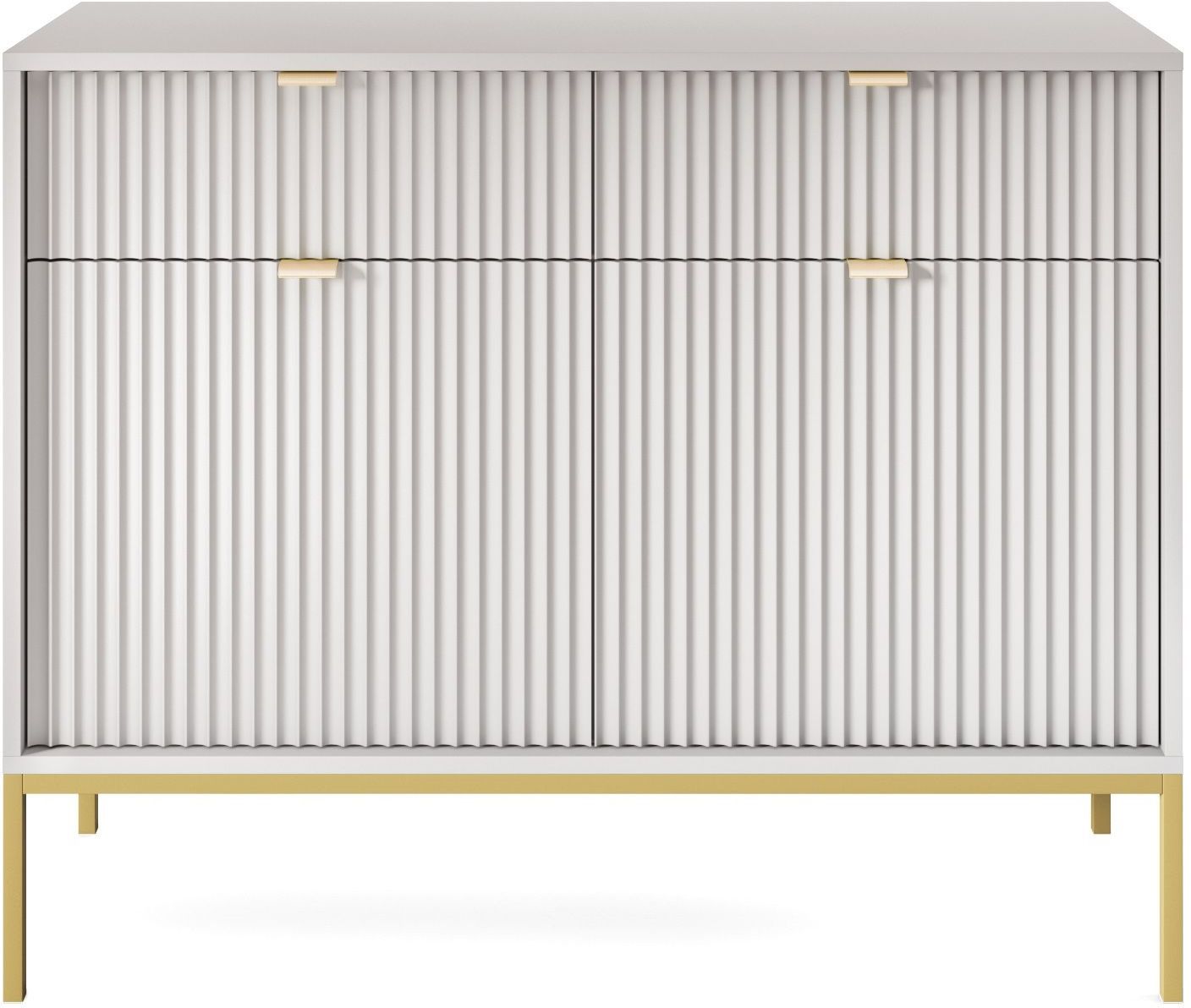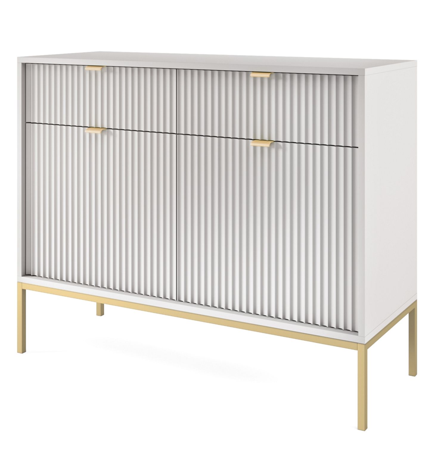 Ο μοντέρνος, μινιμαλιστικός σχεδιασμός σε συνδυασμό με το ανοιχτό γκρι χρώμα κάνει το μπουφέ Nova να φαίνεται εξαιρετικά κομψός και μοντέρνος. Μια απλή αλλά κομψή φόρμα με διακοσμητικά αυλάκια στις μπροστινές όψεις είναι ότι πρέπει για τους λάτρεις του μοντέρνου design. Η μεταλλική βάση δίνει στη δομή ελαφρότητα και το σύνολο συμπληρώνεται από διακοσμητικές λαβές σε χρυσό.