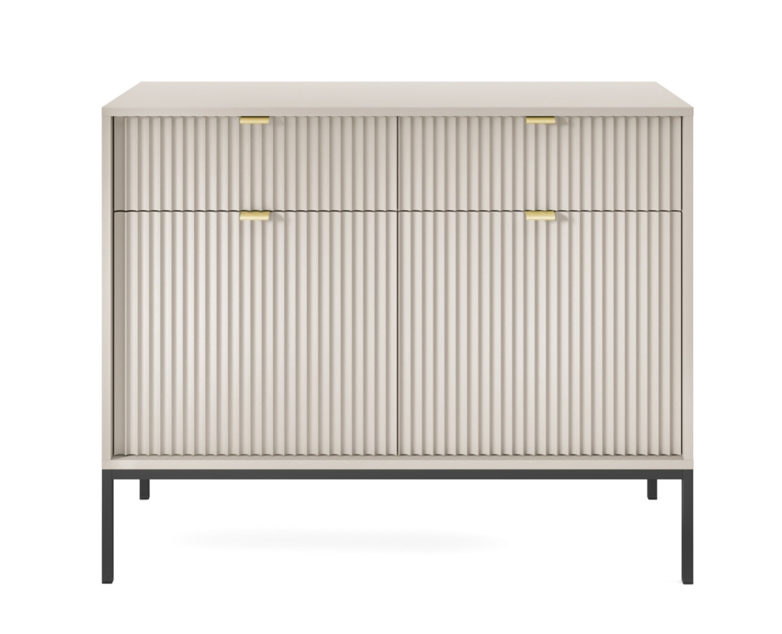 Ο μοντέρνος, μινιμαλιστικός σχεδιασμός σε συνδυασμό με το λευκό χρώμα άμμου κάνει το μπουφέ Nova να φαίνεται εξαιρετικά κομψός και μοντέρνος. Μια απλή αλλά κομψή φόρμα με διακοσμητικά αυλάκια στις μπροστινές όψεις είναι ότι πρέπει για τους λάτρεις του μοντέρνου design. Η μεταλλική βάση δίνει στη δομή ελαφρότητα και το σύνολο συμπληρώνεται από διακοσμητικές λαβές σε χρυσό.