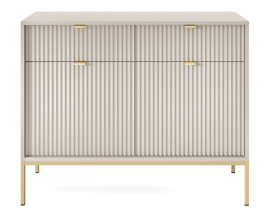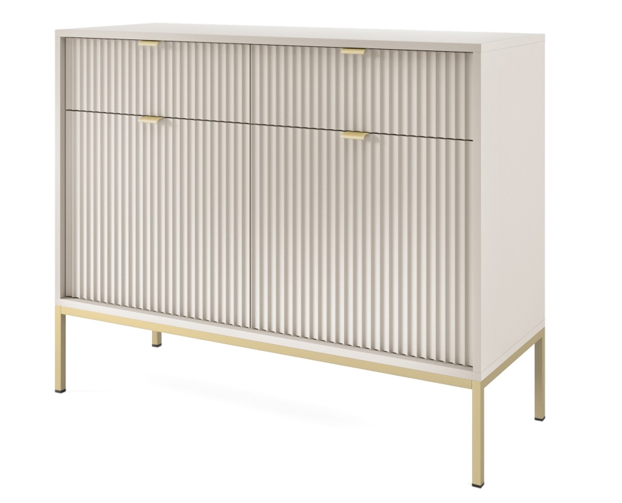 Ο μοντέρνος, μινιμαλιστικός σχεδιασμός σε συνδυασμό με το λευκό χρώμα άμμου κάνει το μπουφέ Nova να φαίνεται εξαιρετικά κομψός και μοντέρνος. Μια απλή αλλά κομψή φόρμα με διακοσμητικά αυλάκια στις μπροστινές όψεις είναι ότι πρέπει για τους λάτρεις του μοντέρνου design. Η μεταλλική βάση δίνει στη δομή ελαφρότητα και το σύνολο συμπληρώνεται από διακοσμητικές λαβές σε χρυσό.