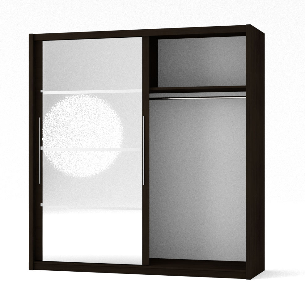 Συρόμενη Δίφυλλη Ντουλάπα υψηλής ποιότητας ILONA. Το εξωτερικό δεξί φύλλο της ντουλάπας διαθέτει καθρέπτη. Στο εσωτεικό της απο την αριστερη πλευρά διαθέτει 4 ράφια και στη δεξιά πλευρά διαθέτει ένα ράφι στο επάνω μέρος και μια βέργα για το κρέμασμα των ρούχων. Με διακόσμηση MDF στις δύο κάθετες οριζόντιες κολώνες και διακοσμητικό αλουμίνιο στις πόρτες για καλύτερο αισθητικό αποτέλεσμα. Ένα κόσμημα για το δωμάτιο σας το οποίο μπορεί να συνδυαστεί εύκολα με άλλα έπιπλα για ένα όμορφο αποτέλεσμα.