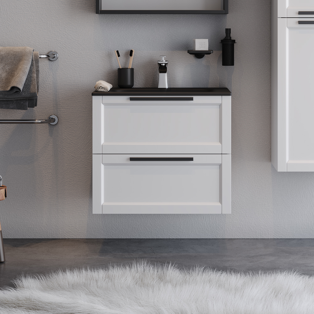 Πάγκος LAGUNA Λευκό MDF 18mm Λάκα 60 3SLAG060WHM 61×46.50x52cm Αποτελείται από: Πάγκος LAGUNA Λευκός 60 κρεμαστός σε ματ λάκα και υλικό mdf. Διαθέτει δύο συρτάρια για την τοποθέτηση και οργάνωση αντικειμένων. Νιπτήρας κεραμικός χρώματος μαύρου, κορυφαίας κατασκευής και υψηλής αισθητικής. Διαθέτει οπή υπερχείλισης. Ματ λάκα 2 συστατικών σε MDF. Ο Πάγκος LAGUNA σε Λευκή απόχρωση αποτελεί ένα στυλάτο και μοντέρνο κομμάτι με εργονομικό σχεδιασμό αλλά και λειτουργικότητα. Προσαρμόζεται σε κάθε τύπο μπάνιου. •Πρακτικοί αποθηκευτικοί χώροι •Μηχανισμοί για απαλό και αθόρυβο κλείσιμο •Εύκολη τοποθέτηση •Ετοιμοπαράδοτα προϊόντα Δεν συμπεριλαμβάνονται η μπαταρία και τα διακοσμητικά. Διατίθεται έτοιμο συναρμολογημένο.