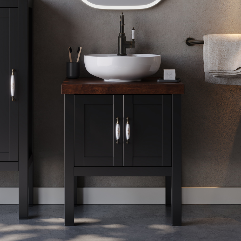 Πάγκος LONDON Μαύρο MDF 18mm Λάκα 65 S3BLON065BLM 65x50x72cm Αποτελείται από: Πάγκος LONDON 65 σε ματ λάκα και υλικό mdf. Διαθέτει ένα ντουλάπι με δύο πόρτες.. Νιπτήρας κεραμικός σε “ελεύθερη” τοποθέτηση πάνω στον πάγκο, χρώματος λευκού, κορυφαίας κατασκευής και υψηλής αισθητικής. Διαθέτει οπή υπερχείλισης. Ματ λάκα 2 συστατικών σε MDF. Ο Πάγκος LONDON 65 Μαύρη απόχρωση αποτελεί ένα στυλάτο και μοντέρνο κομμάτι με εργονομικό σχεδιασμό αλλά και λειτουργικότητα. Προσαρμόζεται σε κάθε τύπο μπάνιου. •Πρακτικοί αποθηκευτικοί χώροι •Μηχανισμοί για απαλό και αθόρυβο κλείσιμο •Εύκολη τοποθέτηση •Ετοιμοπαράδοτα προϊόντα Δεν συμπεριλαμβάνονται η μπαταρία και τα διακοσμητικά. Διατίθεται έτοιμο συναρμολογημένο.