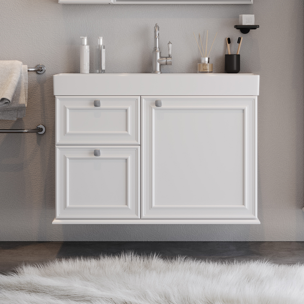 Πάγκος STELLA Λευκό MDF 18mm Λάκα 100 3SSTE100WHM 98×45.5x70cm Αποτελείται από: Πάγκος STELLA Λευκός 98 κρεμαστός σε ματ λάκα και υλικό mdf. Διαθέτει δύο συρτάρια και ένα ντουλάπι για την τοποθέτηση και οργάνωση αντικειμένων. Νιπτήρας κεραμικός χρώματος λευκού, κορυφαίας κατασκευής και υψηλής αισθητικής. Διαθέτει οπή υπερχείλισης. Ματ λάκα 2 συστατικών σε MDF. Πάγκος STELLA σε Λευκή απόχρωση αποτελεί ένα στυλάτο και μοντέρνο κομμάτι με εργονομικό σχεδιασμό αλλά και λειτουργικότητα. Προσαρμόζεται σε κάθε τύπο μπάνιου. •Πρακτικοί αποθηκευτικοί χώροι •Μηχανισμοί για απαλό και αθόρυβο κλείσιμο •Εύκολη τοποθέτηση •Ετοιμοπαράδοτα προϊόντα Δεν συμπεριλαμβάνονται η μπαταρία, η στήλη και τα διακοσμητικά. Διατίθεται έτοιμο συναρμολογημένο.