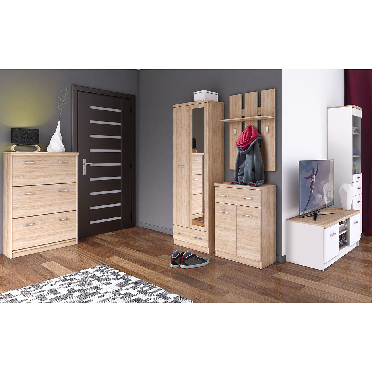 Παπουτσοθήκη ιδανική για την είσοδο του σπιτιού σας. Ένα έπιπλο που διαθέτει τρία ντουλάπια για την αποθήκευση των παπουτσιών σας. Με έξι λεπτά και κομψά χερούλια σε χρώμα Inox. Ένα έπιπλο που δεν πρέπει να λείπει απο κανένα σπίτι.