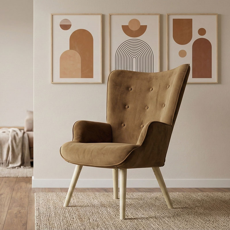 Η πολυθρόνα μπερζέρα Fluffy με διαχρονική πολυτέλεια, είναι φτιαγμένη από μασίφ ξύλο επενδυμένη με ύφασμα υψηλής ποιότητας σε χρώμα ταμπά. Απολαύστε στιγμές χαλάρωσης σε μια εντυπωσιακή κατασκευή.