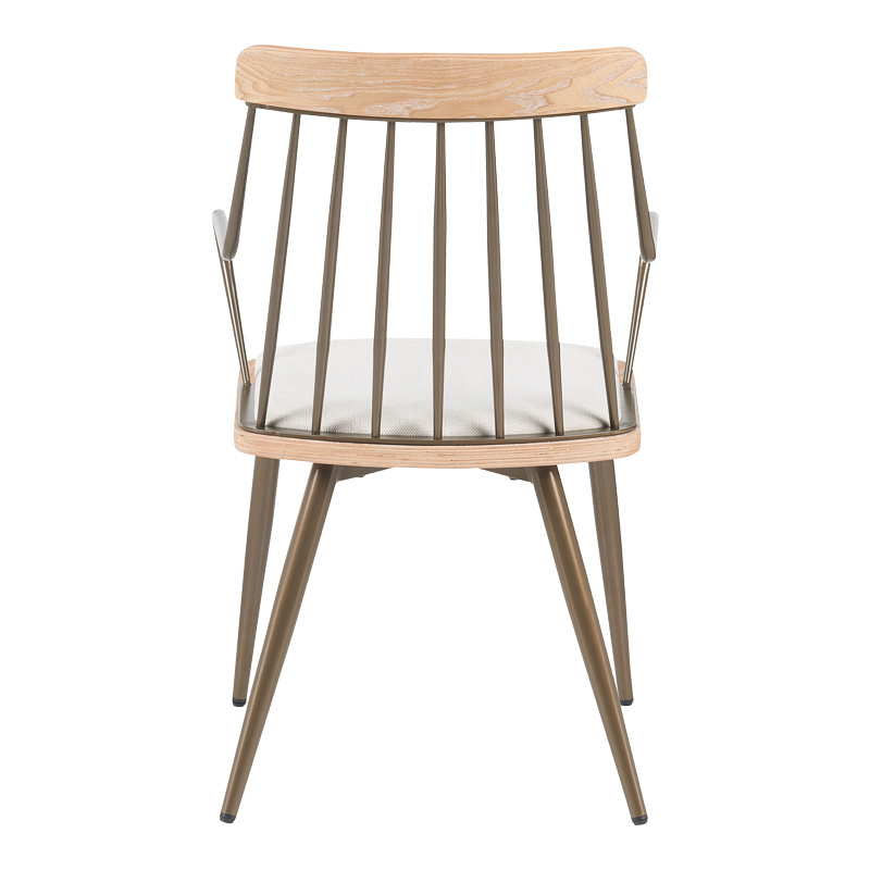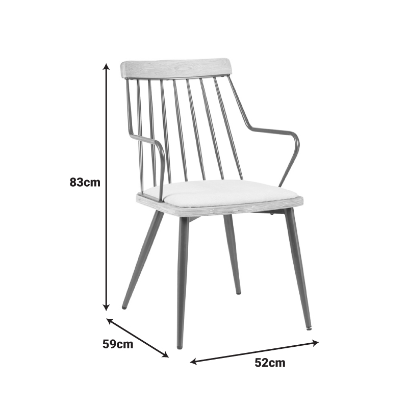 Η πολυθρόνας τραπεζαρίας Posse διακρίνεται για τον εκλεπτυσμένο βιομηχανικό της σχεδιασμό. Διαθέτει ένα άνετο, λεπτό μαξιλάρι καθίσματος , το οποίο πλαισιώνεται από έναν κομψό μεταλλικό σκελετό. Η πλάτη αποτελείται από κάθετες μεταλλικές ράβδους που καταλήγουν σε μια οριζόντια, ξύλινη λεπτομέρεια, προσδίδοντας μια διακριτική αντίθεση. Τα λεπτά, κωνικά μεταλλικά πόδια ενισχύουν την αίσθηση ελαφρότητας και σταθερότητας. Οι καμπύλες μεταλλικές χειρολαβές προσφέρουν επιπλέον άνεση και στυλ.