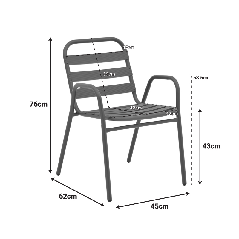 Σταθερός σκελετός από μέταλλο εξαιρετικής ποιότητας με αντοχή σε φθορά και χρόνο, ενώ τα κομμάτια έδρας και πλάτης είναι κατασκευασμένα από φέτες αλουμινίου. Το μέταλλο παρέχει ανθεκτικότητα και σταθερότητα, ενώ οι φέτες αλουμινίου προσθέτουν ελαφρότητα και μια μοντέρνα αίσθηση στον σχεδιασμό. Η πολυθρόνα αυτή είναι ιδανική για χρήση σε εξωτερικούς χώρους, καθώς η ανθεκτικότητα στις καιρικές συνθήκες του αλουμινίου την καθιστά ανθεκτική σε έκθεση στον ήλιο και την υγρασία.