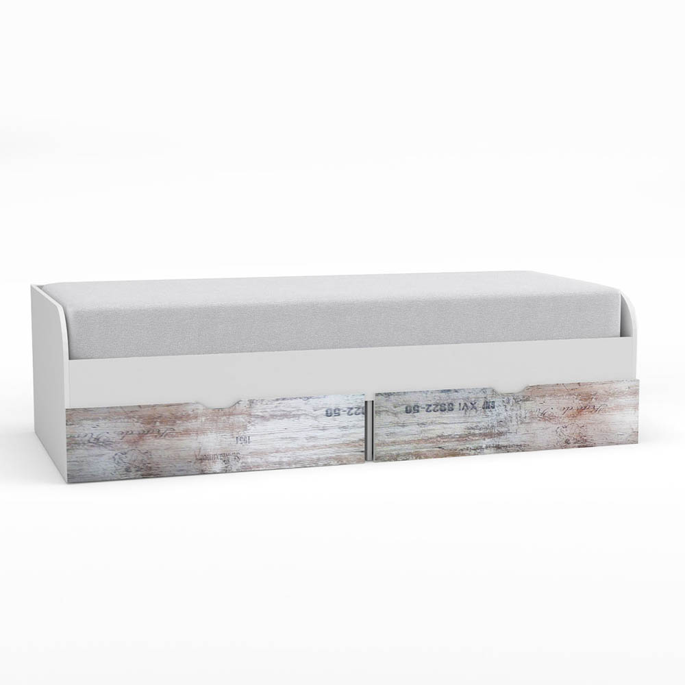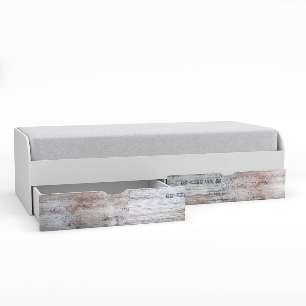 Κρεβάτι Pump με 2 συρτάρια για να αποθηκεύετε είτε ρούχα είτε παιχνίδια των παιδιών σας. Δέχεται στρώμα 90×200 (το στρώμα και οι τάβλες δεν περιλαμβάνονται). Ο συνδυασμός των χρωμάτων Λευκό με Γκρί σχέδια το κάνει ιδιαίτερα ξεχωριστό και αγαπητό. Με 4 μεταλλικές γωνίες για μεγαλύτερη σταθερότητα, και μασίφ ξύλο αριστερά-δεξιά (βάση για να υποδεχθεί το πάτωμα).