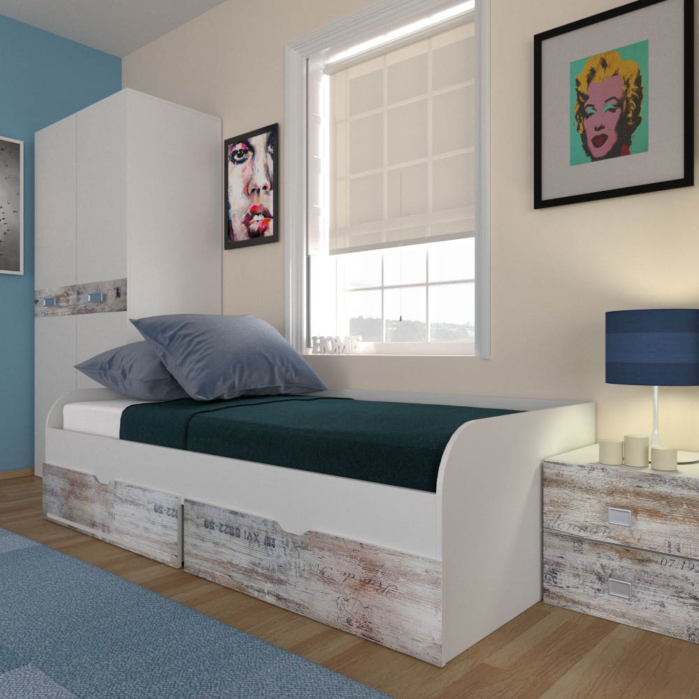 Κρεβάτι Pump με 2 συρτάρια για να αποθηκεύετε είτε ρούχα είτε παιχνίδια των παιδιών σας. Δέχεται στρώμα 90×200 (το στρώμα δεν περιλαμβάνετε). Ο συνδυασμός των χρωμάτων Λευκό με Γκρί σχέδια το κάνει ιδιαίτερα ξεχωριστό και αγαπητό. Με 4 μεταλλικές γωνίες για μεγαλύτερη σταθερότητα, και μασίφ ξύλο αριστερά και δεξιά (βάση για να υποδεχθεί τάβλες οι οποίες συμπεριλαμβάνονται).