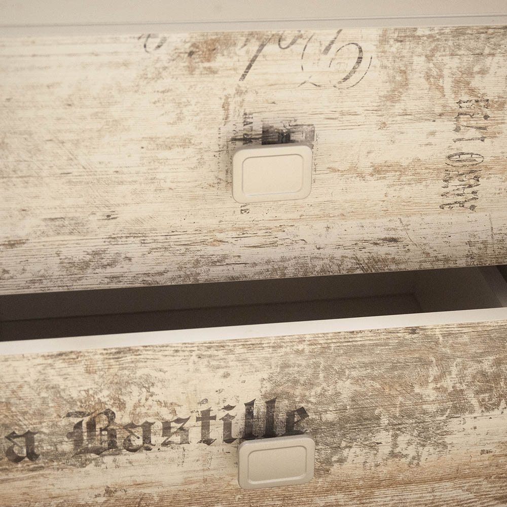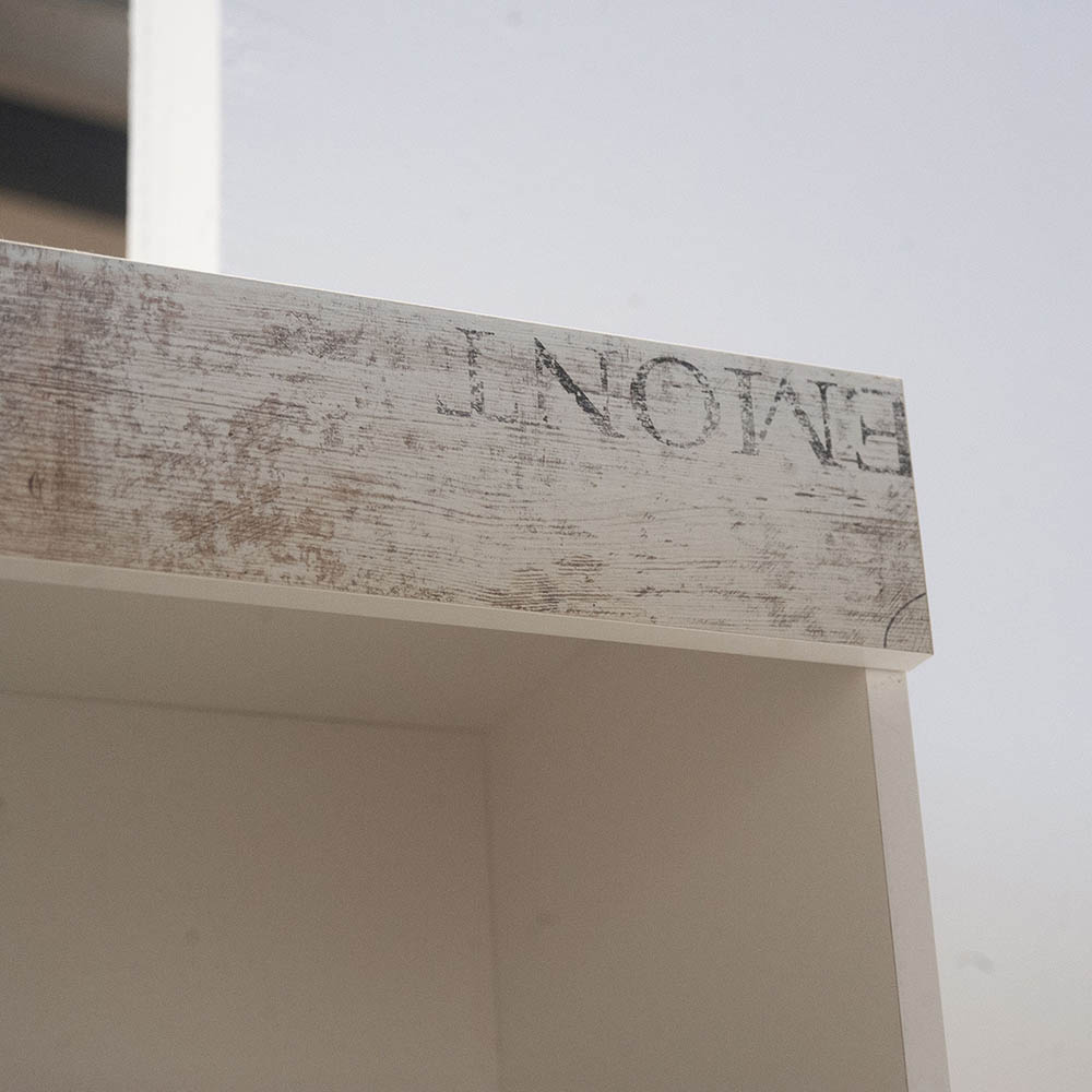 Βιβλιοθήκη υψηλής ποιότητας και αντοχής, σε λευκό-λευκό αντικέ με διακοσμητικές επιγραφές. Το έπιπλο αποτελέιται από 3 ράφια και 2 συρτάρια. Ιδανική λύση για να διακοσμήσετε τον χώρο σας ή το δωμάτιο σας, συνδιάζοντας το με την σύνθεση Pump.