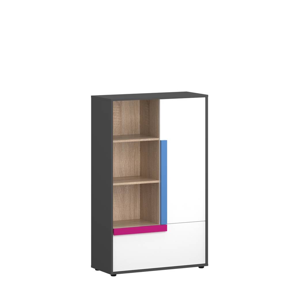 Ραφιέρα για βιβλία και διακοσμητικά υψηλής ποιότητας και αντοχής, σε απόχρωση γραφίτης, σονόμα, λευκό. Το έπιπλο αποτελέιται από δύο ράφια και δύο ντουλάπια καθώς και δύο πόμολα με χρώμα της επιλογής σας. Ιδανική λύση για την οργάνωση και διακόσμηση του παιδικού δωματίου.