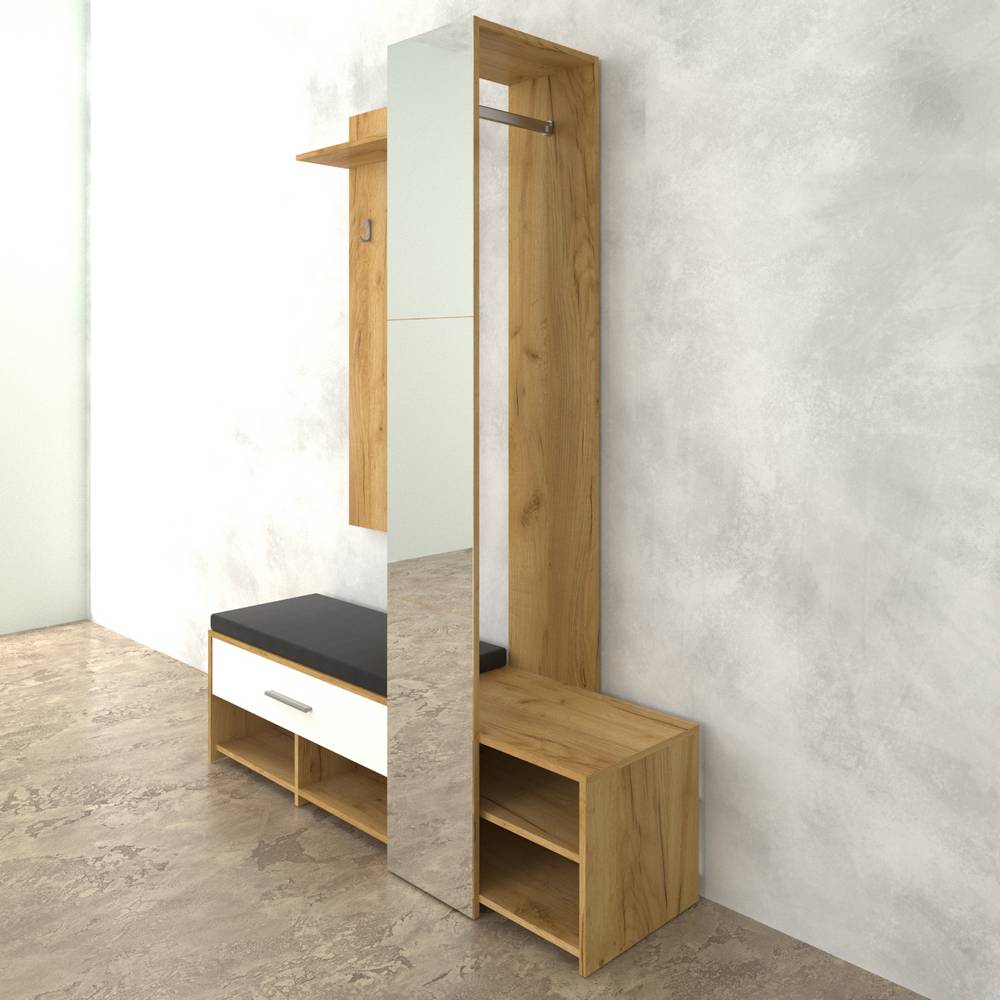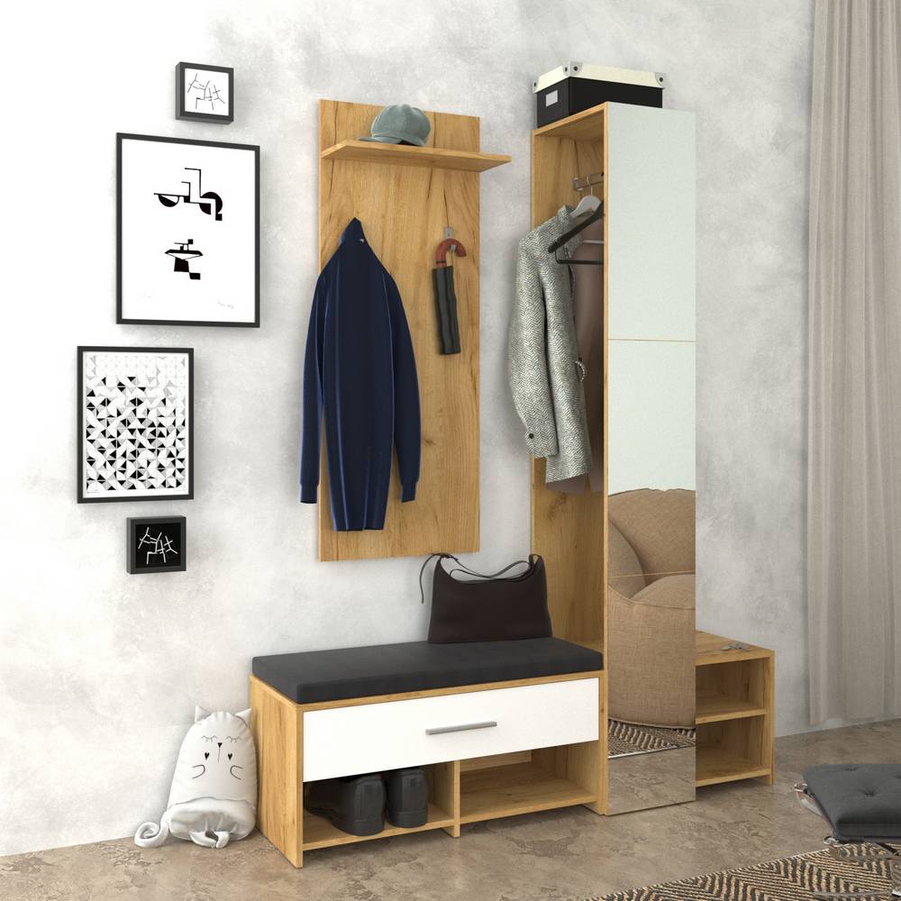 Σετ υψηλής αντοχής και ποιότητας, κατάλληλο για την είσοδο του σπιτιού ή του χωλ, σε απόχρωση δρυς με λευκό και γκρι μαξιλάρι. Το σετ απαρτίζεται από ράφια για να τοποθετήσετε τα παπούτσια σας, ένα συρτάρι, κρεμάστρες για να οργανώσετε το χώρο σας και καθρέπτη. Μια μοντέρνα επιλογή για να τακτοποιήσετε και να διακοσμήσετε την είσοδο του σπιτιού σας.