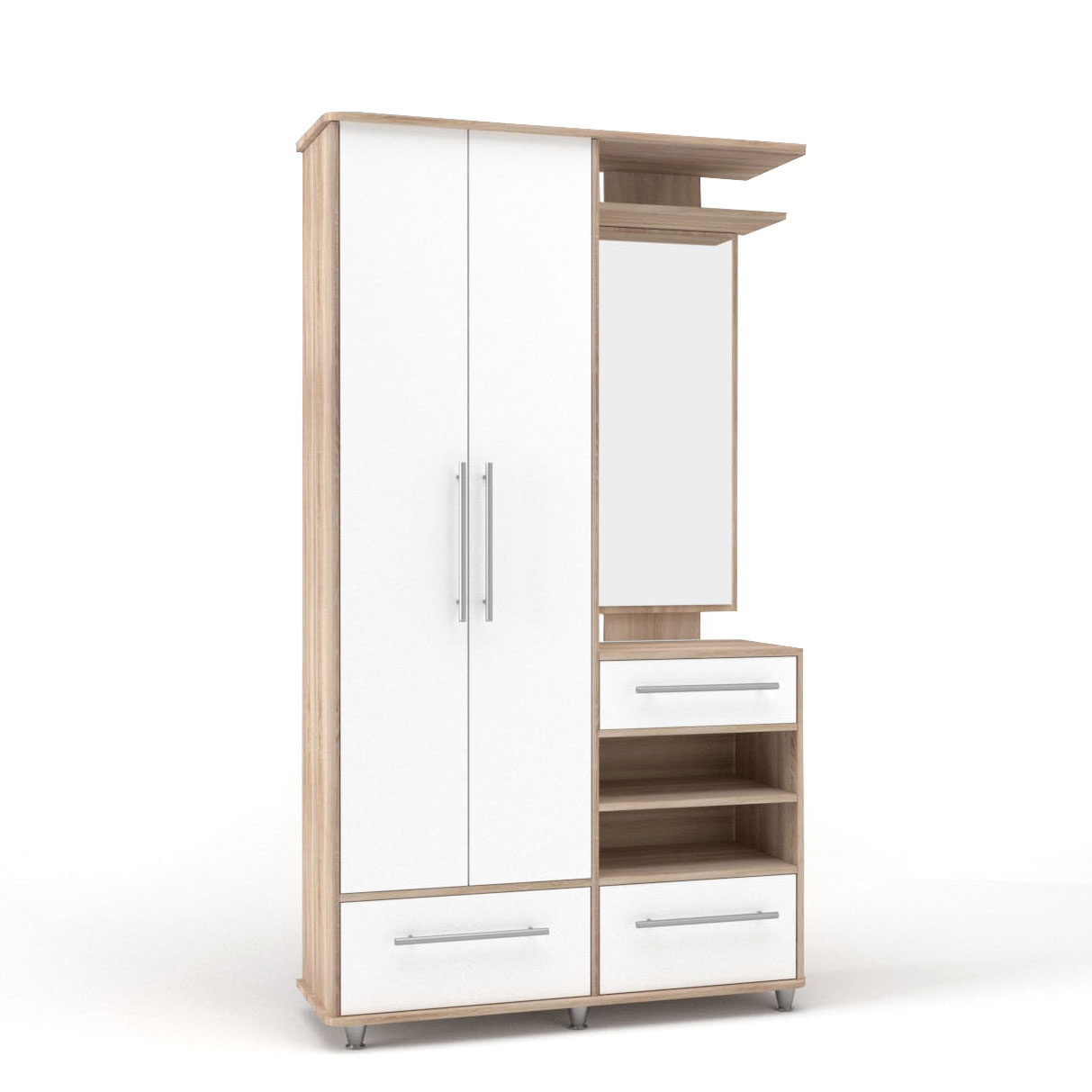 Σετ υψηλής αντοχής και ποιότητας, κατάλληλο για την είσοδο του σπιτιού ή του χωλ, σε λευκή και sonoma απόχρωση. Το σετ απαρτίζεται από μία δίφυλλη ντουλάπα με συρτάρι, ένα καθρέπτη και ένα έπιπλο το οποίο διαθέτει ένα ράφι αποθήκευσης και 2 συρτάρια. Μια μοντέρνα επιλογή για να τακτοποιήσετε και να διακοσμήσετε την είσοδο του σπιτιού σας.