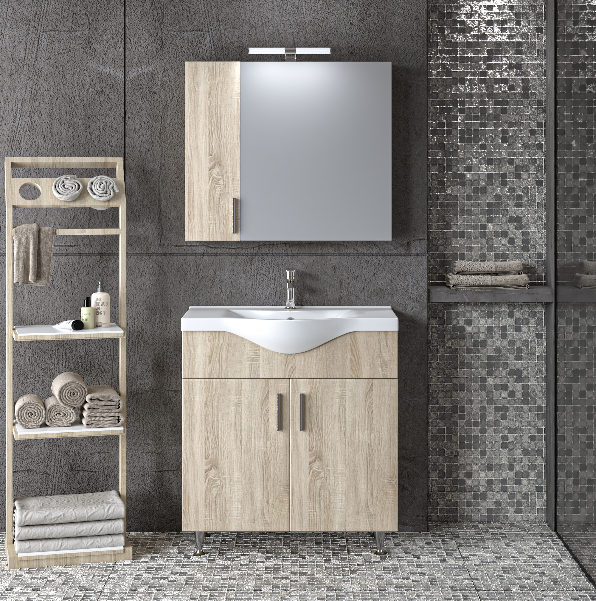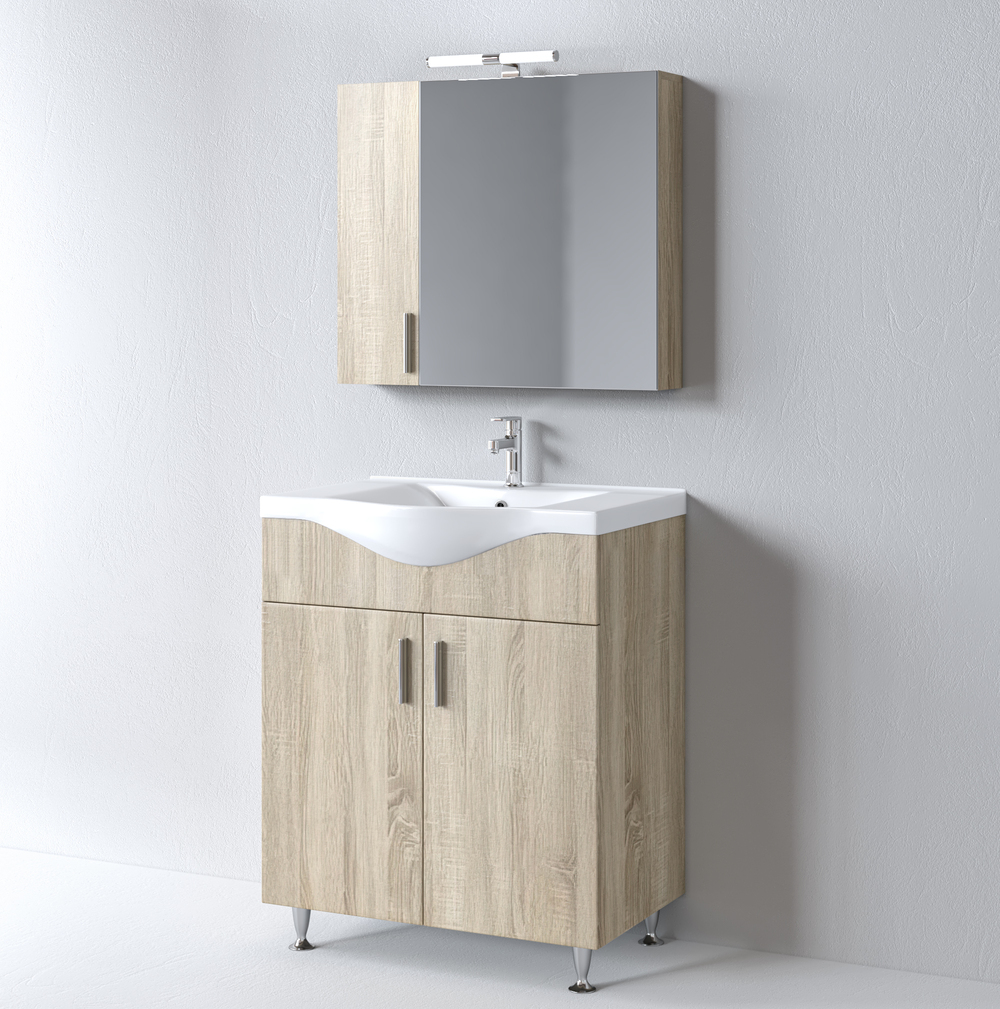 Σετ Έπιπλο Μπάνιου SIENA SONOMA 75 9SSI075SN0W Πάγκο 72x34x83cm Αποτελείται από: •Πάγκος με τέσσερα ποδαράκια SIENA 75 SONOMA. Διαθέτει ευρύχωρο ντουλάπι με δύο πόρτες. Περιλαμβάνει εσωτερικό ράφι που σας προσφέρει έξτρα χώρο για την τοποθέτηση και οργάνωση των αντικειμένων σας. •Καθρέφτης SIENA 75 SONOMA. Περιλαμβάνει πρόσοψη καθρέφτη που ανοίγει προς τα δεξιά και μια μικρότερη ξύλινη πόρτα στο αριστερό πλαϊνό μέρος, στον ίδιο χρωματισμό με τον καθρέφτη, που ανοίγει προς τα αριστερά. Το μικρό ντουλαπάκι διαθέτει ένα ράφι που σας προσφέρει έξτρα αποθηκευτικό χώρο. Το μεγάλο ντουλάπι διαθέτει επίσης εσωτερικό ράφι για την τοποθέτηση των φαρμάκων και αντικειμένων καθημερινής χρήσης. •Νιπτήρας BASIC 75 σε μοντέρνο εργονομικό σχεδιασμό, υψηλής αισθητικής. Η γυαλιστερή πορσελάνινη υφή του και το σχήμα του, αναδεικνύει την εμφάνιση του. Διαθέτει οπή υπερχείλισης. Μελαμίνη 16mm πάχος Το Σετ Έπιπλο Μπάνιου Siena στην απόχρωση Sonoma που συνδυάζει την όψη του ξύλου με τις νέες τάσεις στο χρώμα, δίνουν ένα άψογο διαχρονικό αποτέλεσμα. Αποτελεί ένα στυλάτο και μοντέρνο κομμάτι για το μπάνιο σας! •Πρακτικοί αποθηκευτικοί χώροι • Μηχανισμοί για απαλό και αθόρυβο κλείσιμο • Εύκολη τοποθέτηση • Ετοιμοπαράδοτα προϊόντα Δεν συμπεριλαμβάνονται το φωτιστικό, η μπαταρία και η στήλη. Διατίθεται έτοιμο συναρμολογημένο.