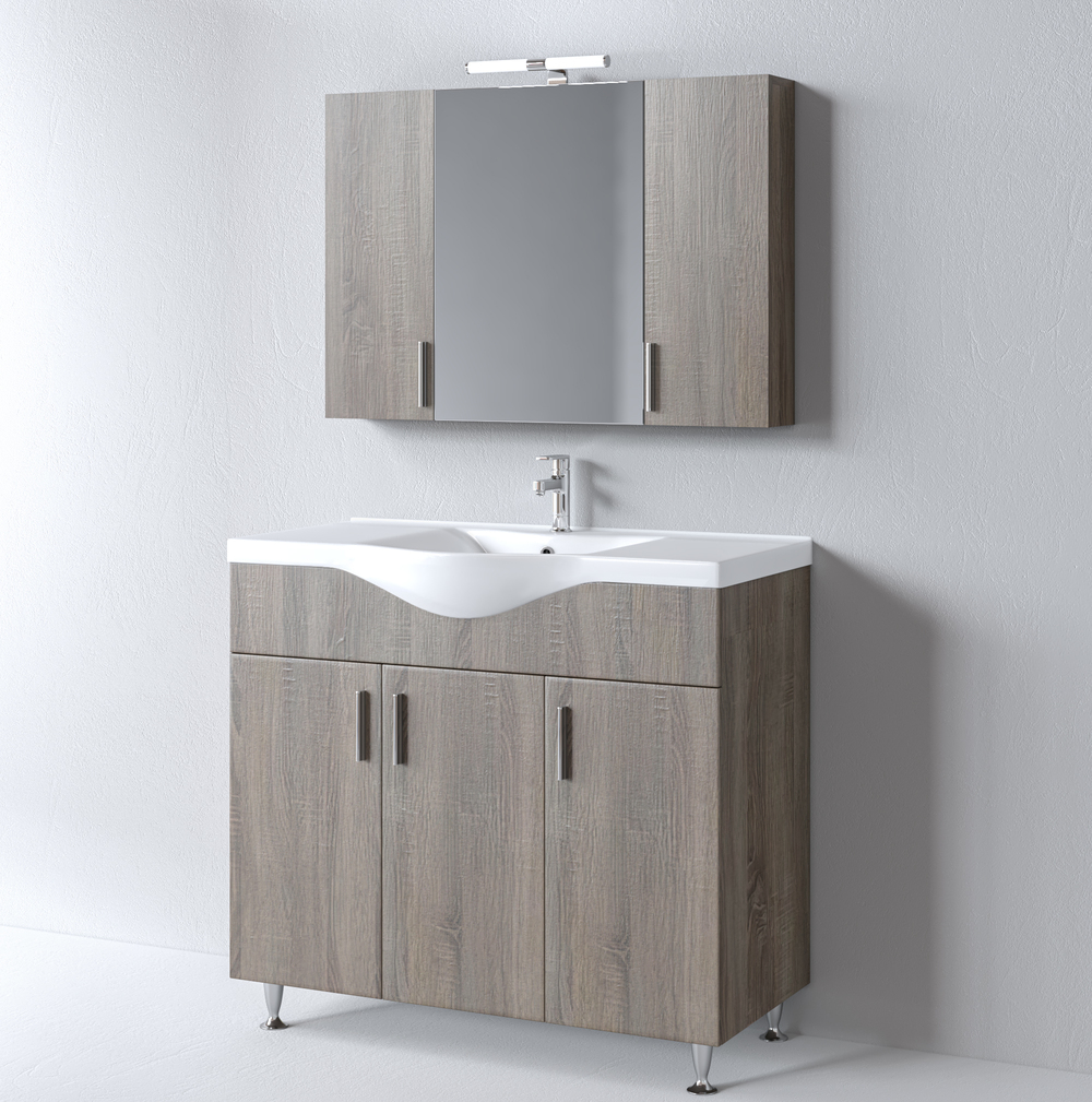 Σετ Έπιπλο Μπάνιου SIENA SONOMA DARK 100 9SSI100SD0W Πάγκο 96x34x83cm Αποτελείται από: •Πάγκος με τέσσερα ποδαράκια SIENA 100 SONOMA DARK. Διαθέτει ένα ευρύχωρο ντουλάπι με δύο πόρτες και ακόμα ένα μικρότερο με μία πόρτα. Το κάθε ντουλάπι περιλαμβάνει εσωτερικό ράφι που σας προσφέρει έξτρα χώρο για την τοποθέτηση και οργάνωση των χρηστικών σας αντικειμένων. •Καθρέφτης SIENA 95 SONOMA DARK. Περιλαμβάνει πρόσοψη καθρέφτη που ανοίγει προς τα δεξιά και δύο μικρότερες ξύλινες πόρτες στα πλαϊνά μέρη, στον ίδιο χρωματισμό με τον καθρέφτη. Το μικρά αυτά ντουλαπάκια διαθέτουν από ένα ράφι που σας προσφέρει έξτρα αποθηκευτικό χώρο. Το μεγάλο μεσαίο ντουλάπι διαθέτει επίσης εσωτερικό ράφι για την τοποθέτηση των φαρμάκων και αντικειμένων καθημερινής χρήσης. •Νιπτήρας BASIC 100 σε μοντέρνο εργονομικό σχεδιασμό, υψηλής αισθητικής. Η γυαλιστερή πορσελάνινη υφή του και το σχήμα του, αναδεικνύει την εμφάνιση του. Διαθέτει οπή υπερχείλισης. Μελαμίνη 16mm πάχος Το Σετ Έπιπλο Μπάνιου Siena στην απόχρωση Sonoma Dark αποτελεί ένα στυλάτο και μοντέρνο κομμάτι. Συνδυάζει την όψη του ξύλου με τις νέες τάσεις στο χρώμα και δίνει ένα άψογο διαχρονικό αποτέλεσμα. •Πρακτικοί αποθηκευτικοί χώροι • Μηχανισμοί για απαλό και αθόρυβο κλείσιμο • Εύκολη τοποθέτηση • Ετοιμοπαράδοτα προϊόντα Δεν συμπεριλαμβάνονται το φωτιστικό και η μπαταρία. Διατίθεται έτοιμο συναρμολογημένο.