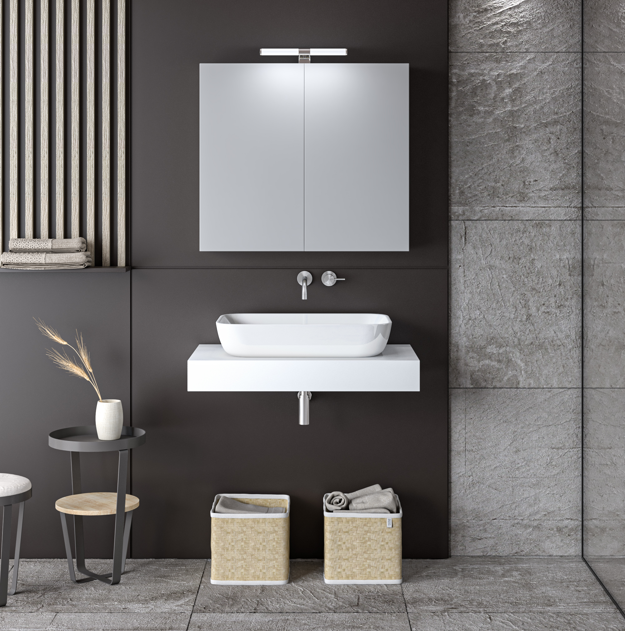 ΣΕΤ ΕΠΙΠΛΟΥ STONE 80cm χρ. ΛΕΥΚΟ με γκρι νερά 9SSTO080WH Αποτελείται από: Sintered Stone κρεμαστή βάση για κορυφαία ποιότητα και υψηλή αντοχή και αισθητική. Σκληρό, ανθεκτικό και ελαφρύ υλικό σε χρώμα άσπρο.Διατίθεται ατρύπητο Καθρέφτης OMEGA Λευκό 75 . Περιλαμβάνει πρόσοψη καθρέφτη με δύο πόρτες. Διαθέτει εσωτερικό ράφι για να οργανώνετε καλύτερα την αποθήκευση χρηστικών αντικειμένων καθημερινής χρήσης για όλα τα μέλη της οικογένειάς σας. Νιπτήρα επικαθούμενο πορσελάνης Χαρακτηριστικά: Εύκολη τοποθέτηση Ετοιμοπαράδοτα προϊόντα Δεν περιλαμβάνει το φωτιστικό, τη μπαταρία, τη στήλη, τα διακοσμητικά κ τη βαλβίδα. Διατίθεται έτοιμο συναρμολογημένο.