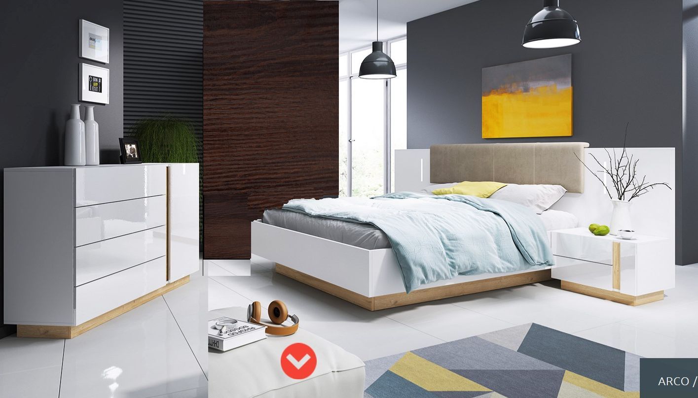 Ο μινιμαλισμός της συλλογής Arco είναι ιδανικός για ένα μοντέρνο υπνοδωμάτιο. Λευκό high gloss στα μέτωπα και μια νότα από χρυσό δρυ θα μετατρέψουν την κρεβατοκάμαρά σας σε ένα μοναδικό μέρος.