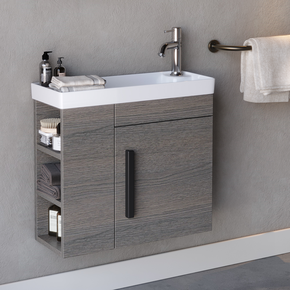 ΣΕΤ ΠΑΓΚΟΣ SAHRA 60cm. χρ.ANTHRACITE OAK S3BSAH060ANO Πάγκος SAHRA Ανθρακί 60 κρεμαστός σε ματ λάκα και υλικό MDF. Διαθέτει ένα ντουλάπι και από το πλάι έχει άνοιγμα με τρία ράφια για την τοποθέτηση και οργάνωση αντικειμένων. Νιπτήρας πορσελάνης χρώματος λευκού, κορυφαίας κατασκευής και υψηλής αισθητικής. Διαθέτει οπή υπερχείλισης. Ματ λάκα 2 συστατικών σε MDF. Ο Πάγκος SAHRA σε Ανθρακί απόχρωση αποτελεί ένα στυλάτο και μοντέρνο κομμάτι με εργονομικό σχεδιασμό αλλά και λειτουργικότητα. Προσαρμόζεται σε κάθε τύπο μπάνιου. •Πρακτικοί αποθηκευτικοί χώροι •Μηχανισμοί για απαλό και αθόρυβο κλείσιμο •Εύκολη τοποθέτηση •Ετοιμοπαράδοτα προϊόντα Δεν συμπεριλαμβάνονται η μπαταρία και τα διακοσμητικά. Διατίθεται έτοιμο συναρμολογημένο.