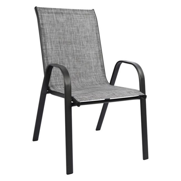 Αυτό το Σετ τραπεζαρίας εξωτερικού χώρου διαθέτει τραπέζι με ΜΑΥΡΟ μεταλλικό σκελετό και γυάλινη θολή ΕΝΙΣΧΥΜΕΝΗ επιφάνεια, και 4 ΜΑΥΡΕΣ μεταλλικές στοιβαζόμενες πολυθρόνες με κάθισμα & πλάτη από ύφασμα textilene (2×1) σε ΜΑΥΡΟ χρώμα.