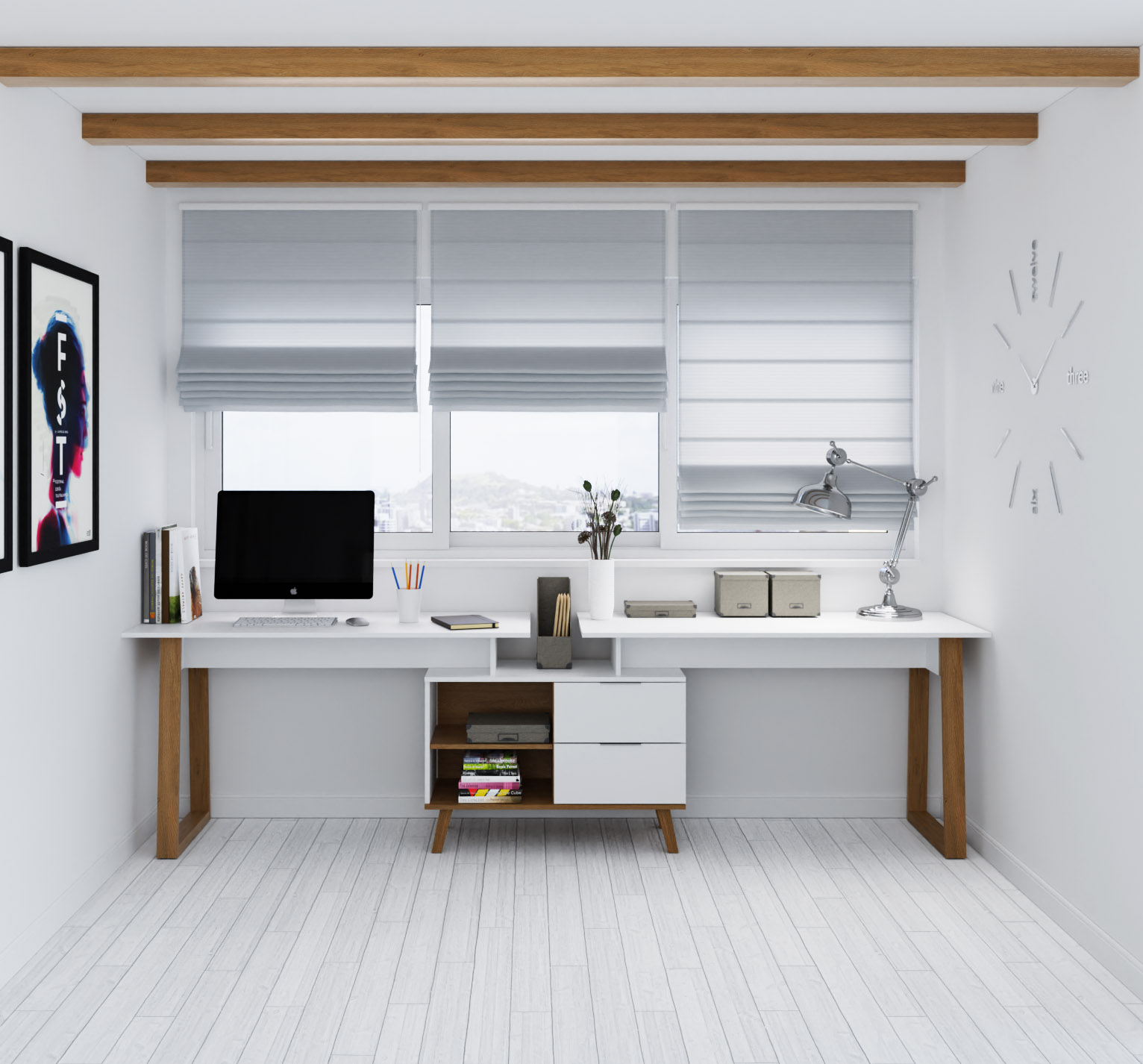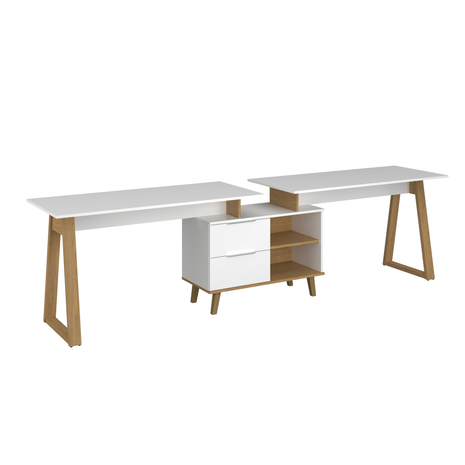 Σύνθεση γραφείου εξαιρετικής ποιότητας και υψηλής αντοχής, σε λευκή απόχρωση με σονόμα. Η σύνθεση απαρτίζεται από δύο γραφεία με διαστάσεις 138x60x77cm και μία συρταρίερα με διάσταση 90x40x61cm, δύο συτρτάρια με μεταλλικά χερούλια, δύο ανοιχτούς αποθηκευτικούς χώρους και μασίφ ξύλινα ποδαράκια για στήριξη. Μπορείτε να την συναρμολογήσετε με διάφορους τρόπους, όπως σε ευθεία, ή σχηματίζοντας γωνία, ανάλογα με τον χώρο σας. Ιδανική λύση για να οργανώσετε το δωμάτιο μικρών και μεγάλων, ή τον εργασιακό σας χώρο, με μίνιμαλ και μοντέρνο τρόπο.
