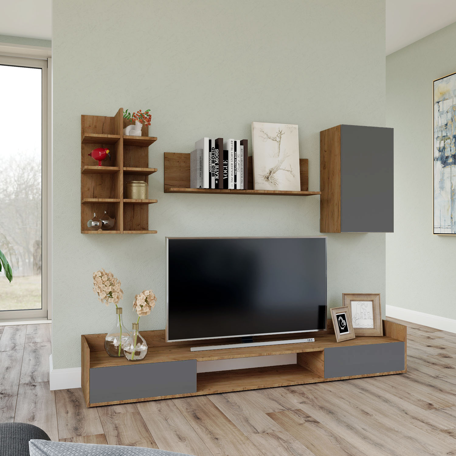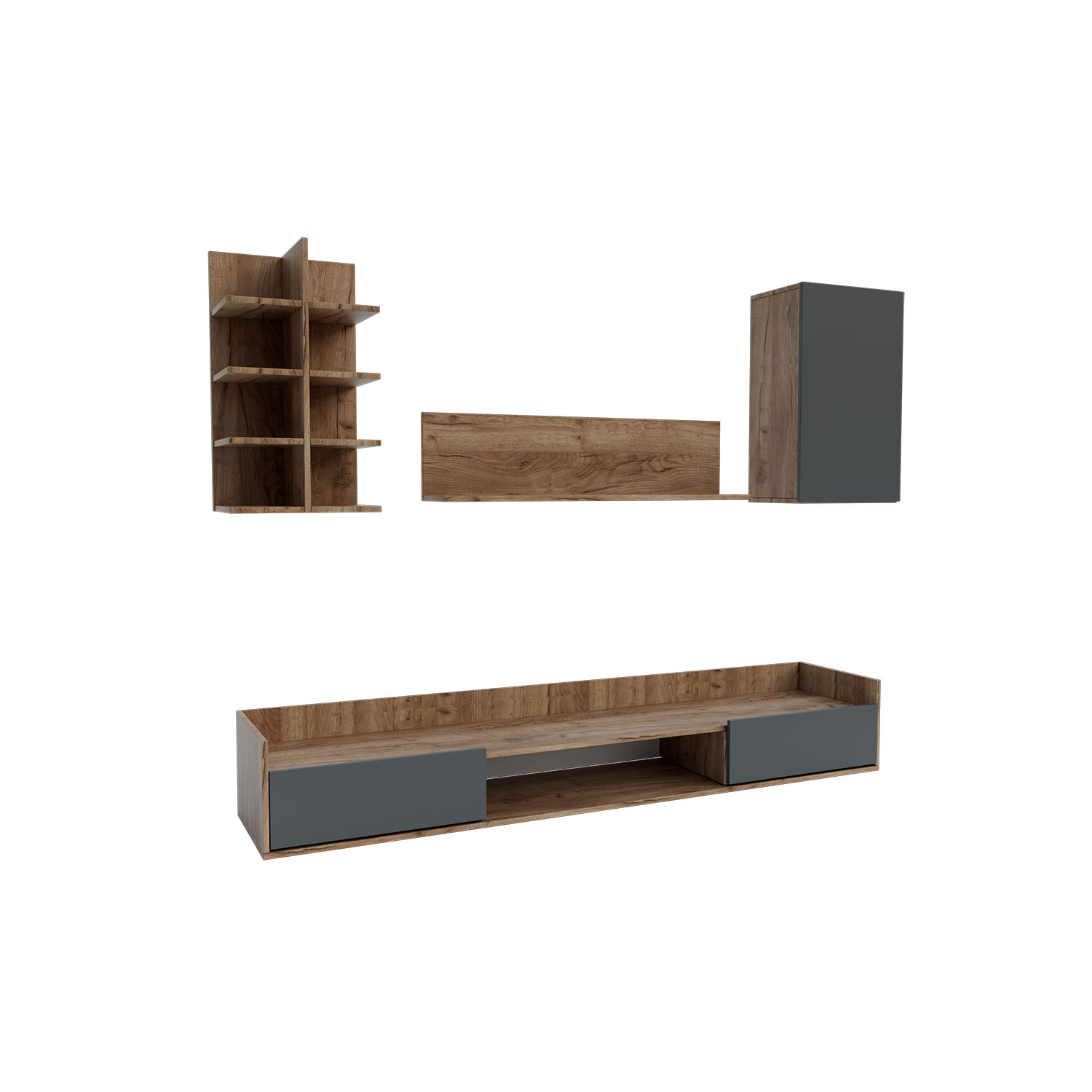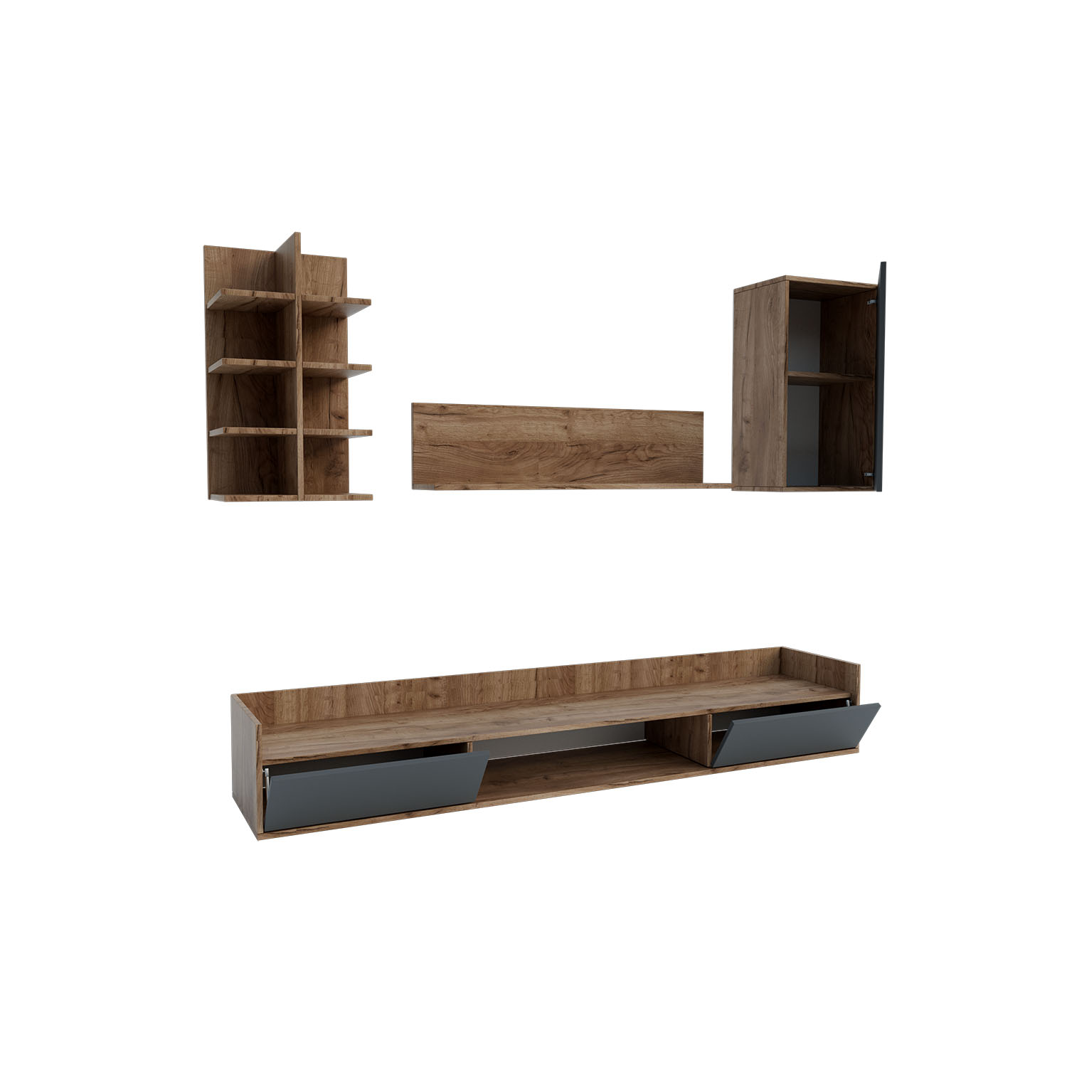 Σύνθεση Τηλεόρασης Callisto, εξαιρετικής ποιότητας και υψηλής αντοχής, με ιδιαίτερο συνδυασμό χρωμάτων, σκούρο δρυς και γραφίτη.