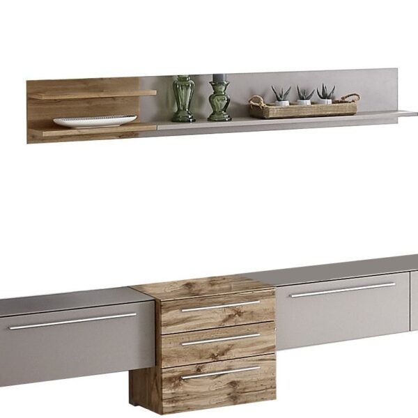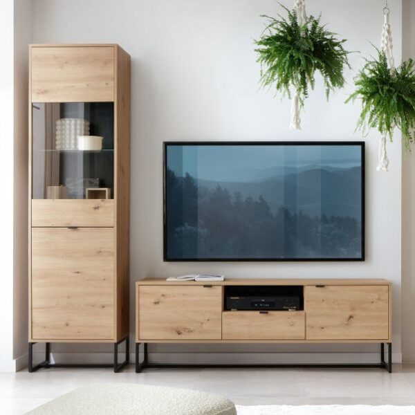Σύνθεση Τηλεόρασης 3 τεμαχίων Verne. Αποτελείται απο Έπιπλο τηλεόρασης με διαστάσεις 137.9x45x52.1, ένα ράφι τοίχου κρεμαστό με διαστάσεις 137.9x30x35, μια βιτρίνα με διαστάσεις 59.7×37.2×191.6.