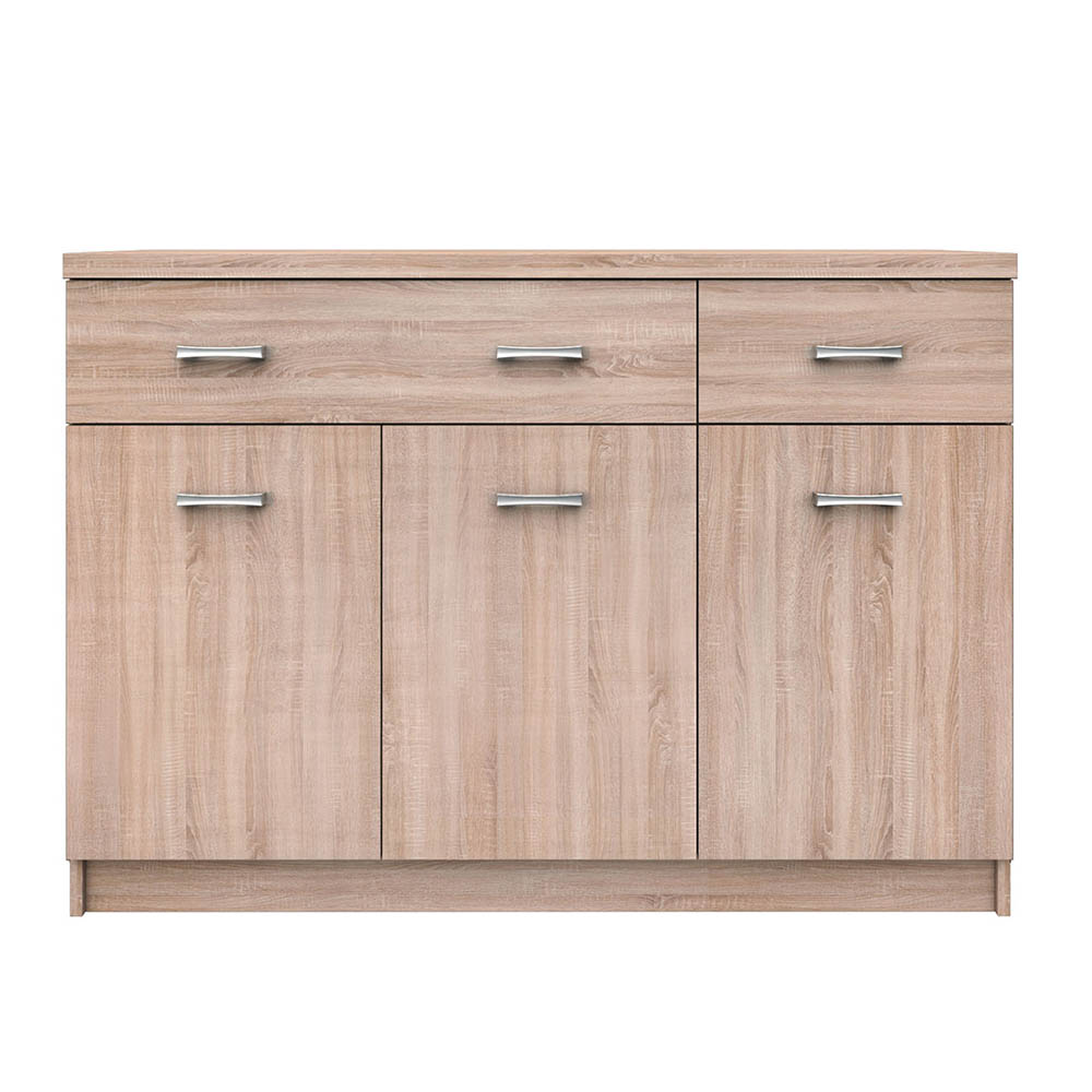 Μπουφές υψηλής ποιότητας και αντοχής, σε σονόμα απόχρωση και διακόσμηση MDF. Το έπιπλο διαθέτει τρία ντουλάπια και δύο συρτάρια. Ιδανική λύση για να διακοσμήσετε και να οργανώσετε τον χώρο σας.