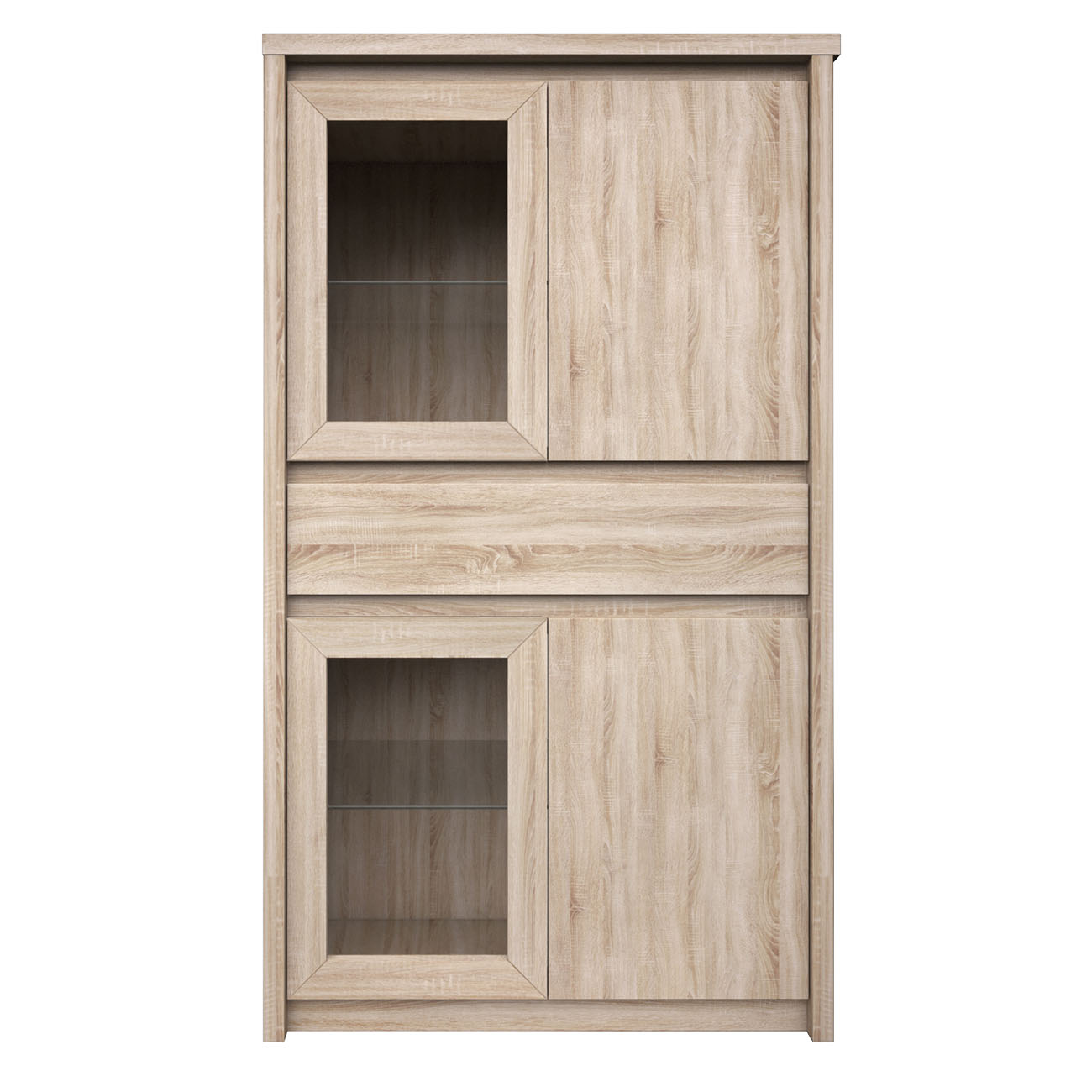 Βιτρίνα NORTON σε χρώμα SONOMA υψηλή ποιότητα κατασκευής και αντοχής. Το έπιπλο απαρτίζεται από τέσσερις ανοιγόμενες πόρτες, εκ των οποιών οι δύο γυάλινες, και τέσσερα ράφια εκ των οποιών τα δύο γυάλινα, επίσης το έπιπλο διαθέτει ένα συρτάρι για εξτρά αποθηκευτικό χώρο. Κατάλληλη για να διακοσμήσετε το σαλόνι αλλά και το υπνοδωμάτιο.