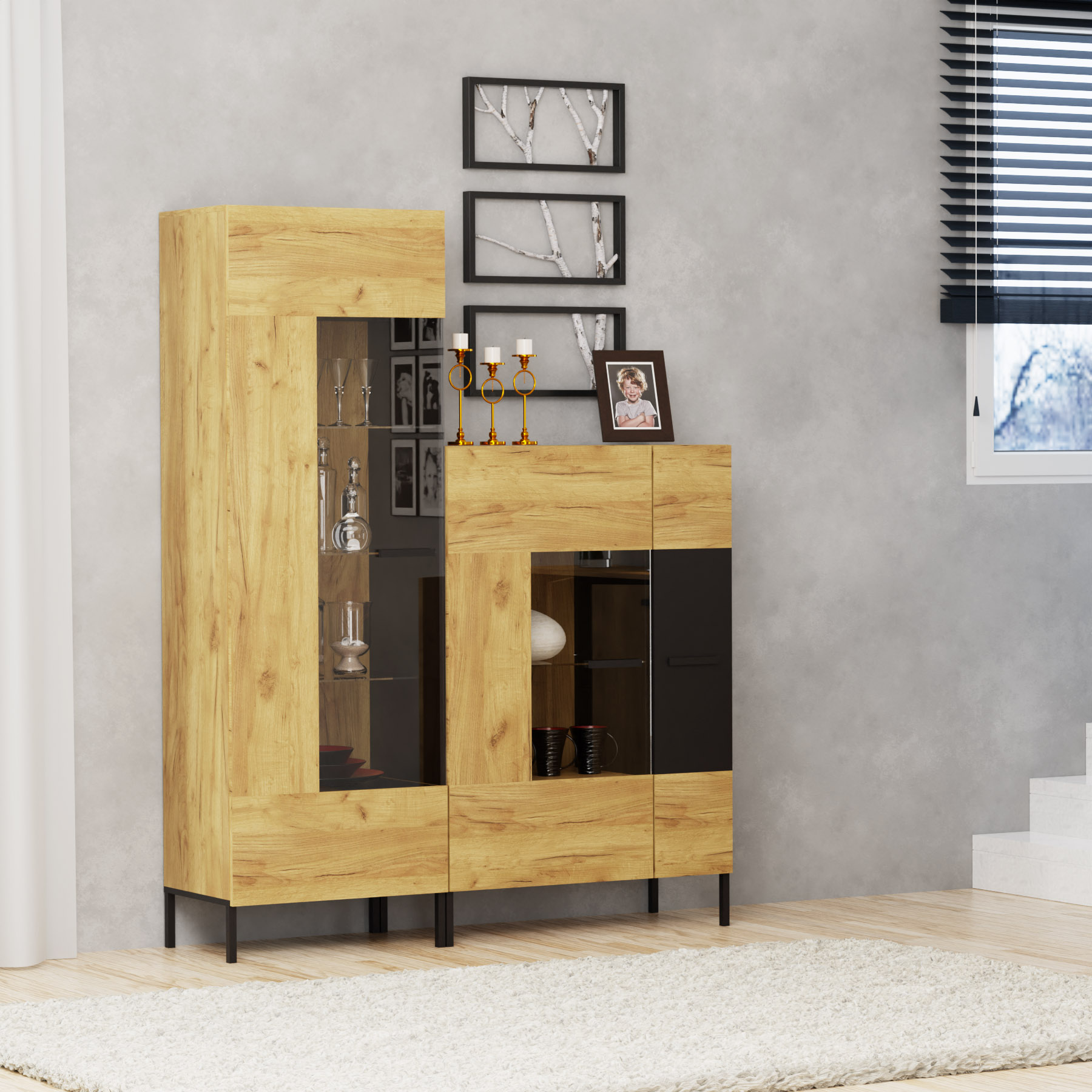 Βιτρίνα Santes, εξαιρετικής ποιότητας και υψηλής αντοχής, σε ιδιαίτερο συνδυασμό χρωμάτων χρυσού δρυς με γραφίτη. Η βιτρίνα διαθέτει δύο ανοιγόμενες πόρτες, η μία με τζάμι, ενώ εσωτερικά περιλαμβάνει ράφια για την διακόσμηση των προσωπικών σας αντικειμένων.