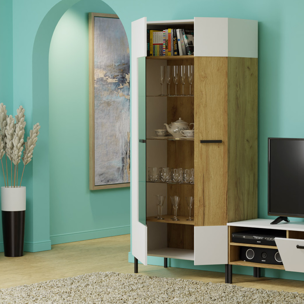 Βιτρίνα Santes, εξαιρετικής ποιότητας και υψηλής αντοχής, σε ιδιαίτερο συνδυασμό χρωμάτων χρυσού δρυς με λευκό. Η βιτρίνα διαθέτει δύο ανοιγόμενες πόρτες, η μία με τζάμι, ενώ εσωτερικά περιλαμβάνει ράφια για την διακόσμηση των προσωπικών σας αντικειμένων.