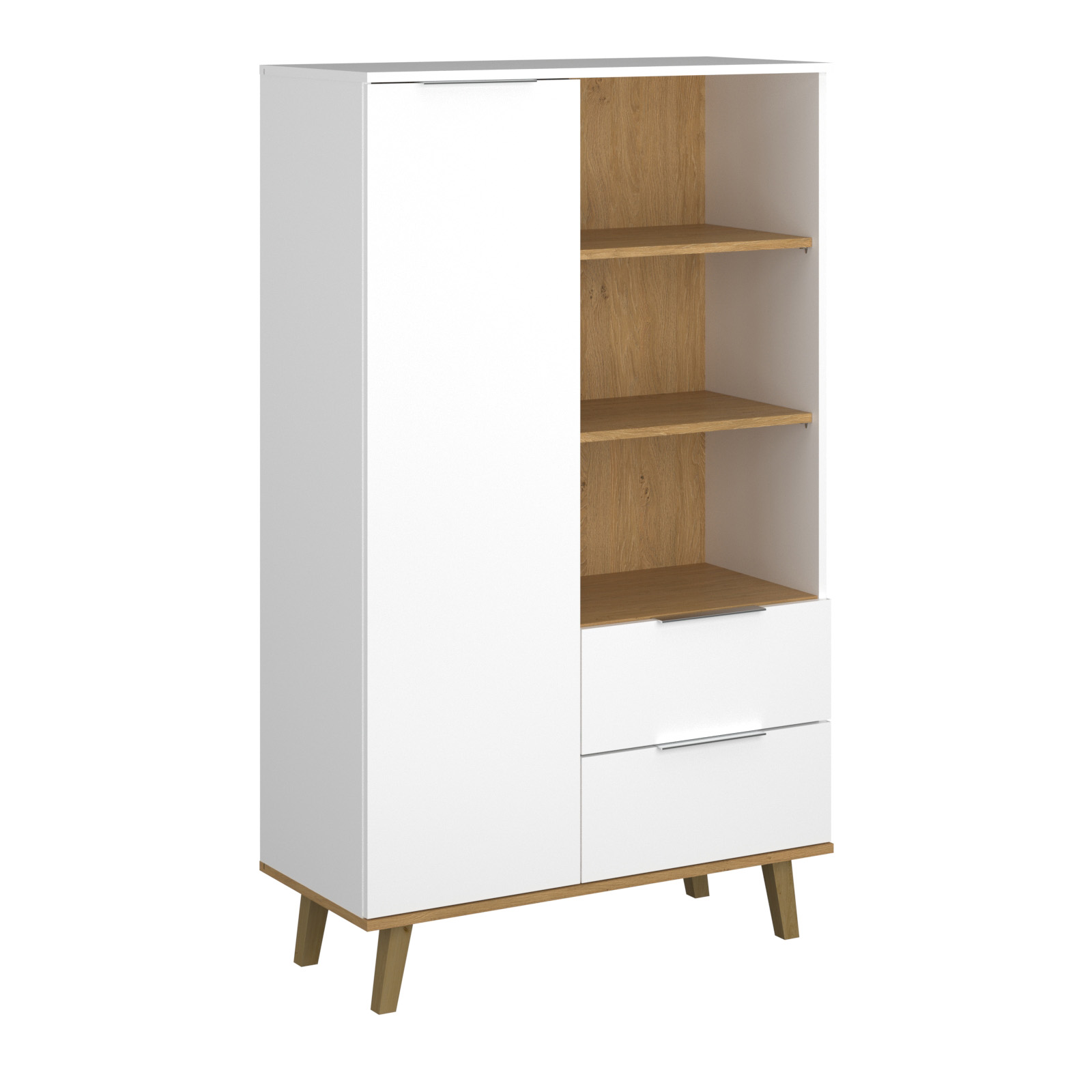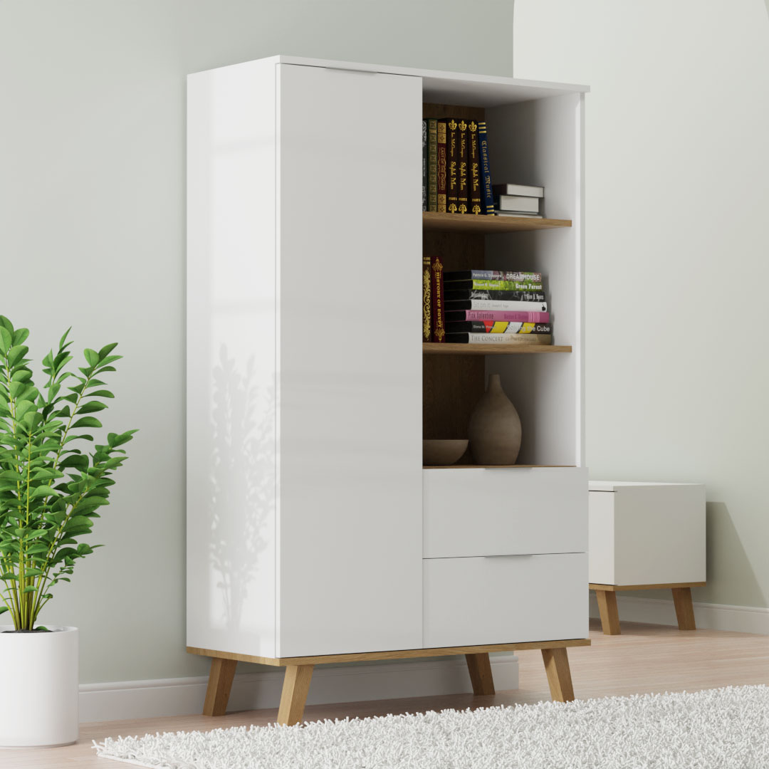 Βιβλιοθήκη Neptune, εξαιρετικής ποιότητας και υψηλής αντοχής, σε λευκή απόχρωση με σονόμα στο κάτω μέρος. Το έπιπλο διαθέτει ένα ντουλάπι με τρία εσωτερικά ράφια, δύο συρτάρια, δύο ράφια, ανοιχτούς αποθηκευτικούς χώρους καθώς και τέσσερα ξύλινα μασιφ πόδια για την στήριξη του επίπλου.